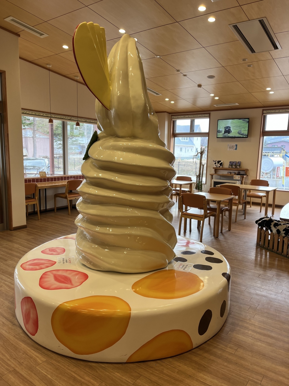 駐車場が広くて立ち寄りやすかったです。店内も明るくて綺麗で、イートインコーナーも広いです。定番のソフトクリームのほか、カレーもメニューにあって食事もできます。お土産コーナーでは、定番のお土産を販売していました。なお、ソフトクリームは、函館空港でも食べられます。
