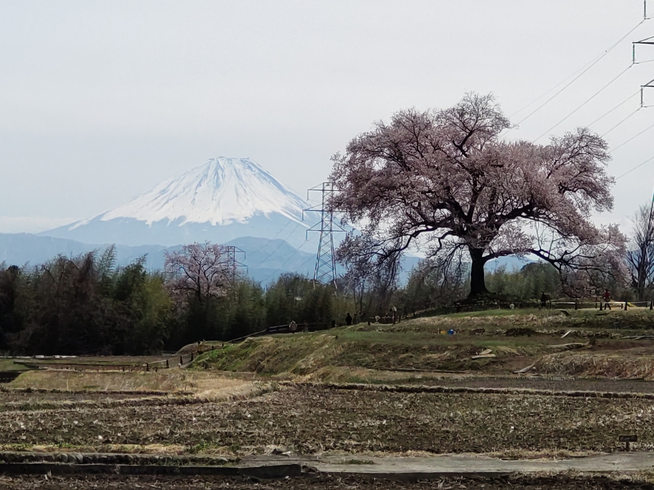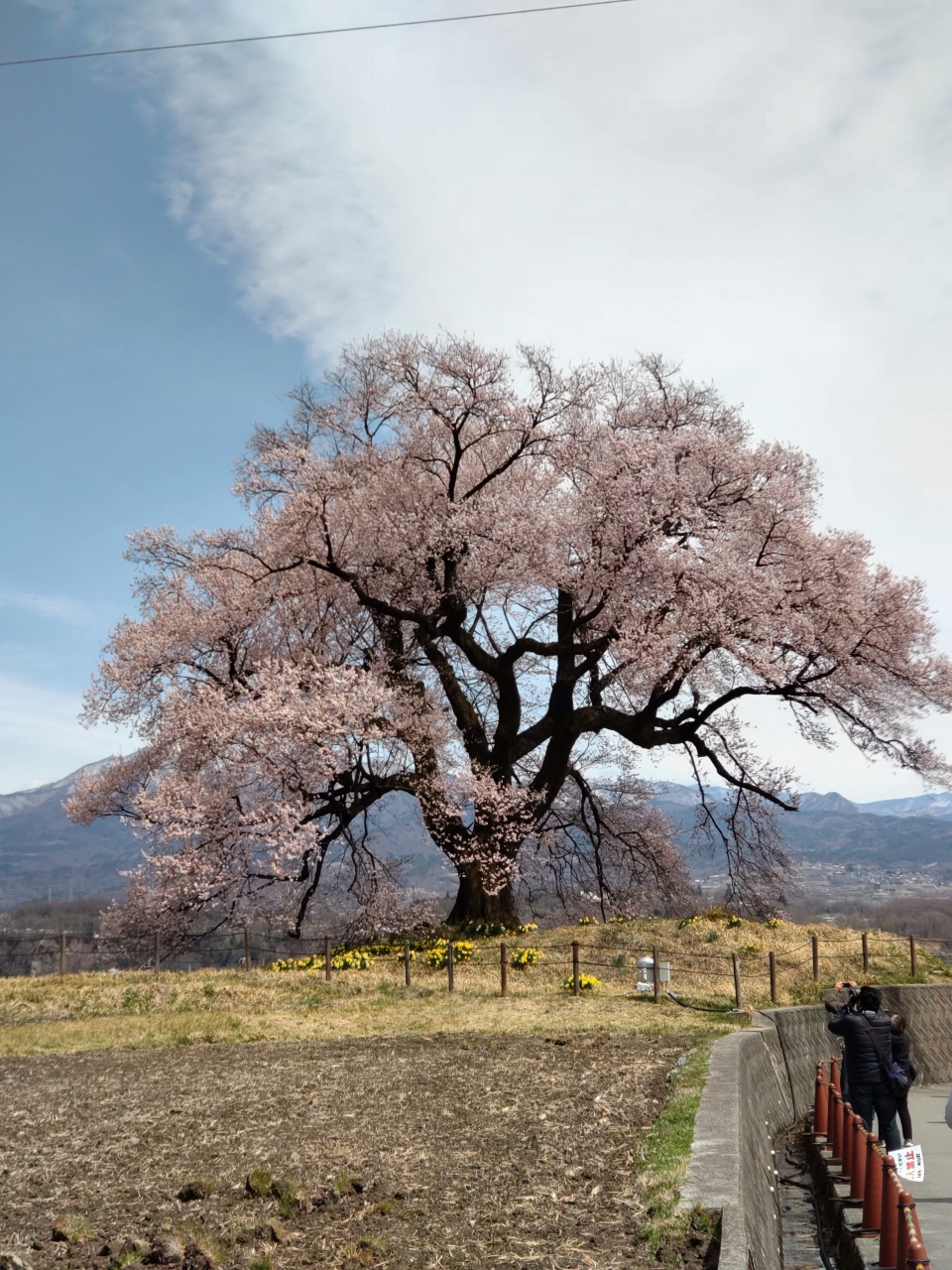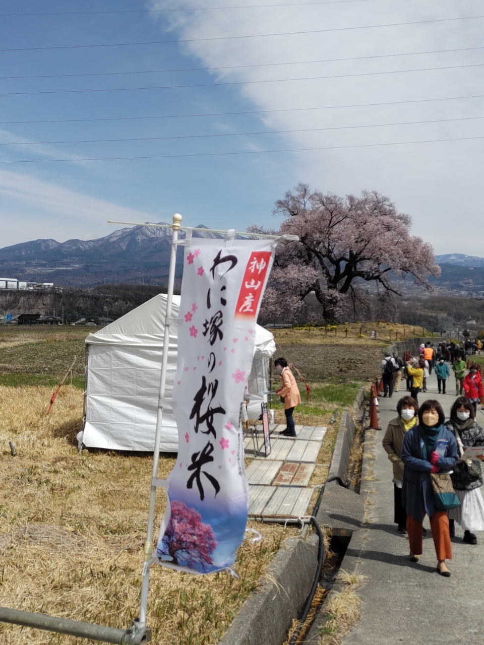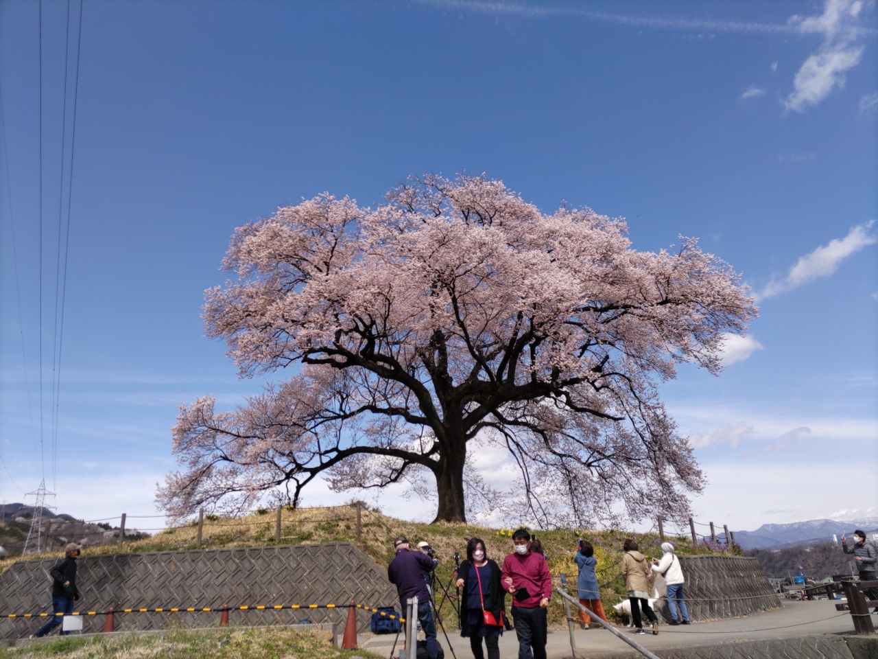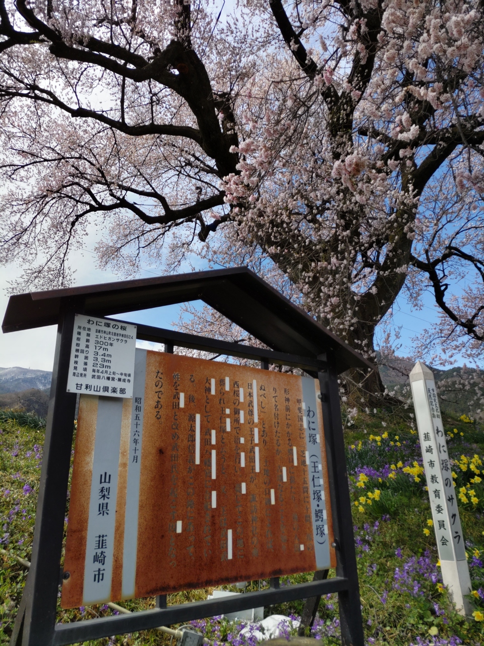 4月初旬に韮崎にあるわに塚に行ってきました。樹齢330年のエドヒガンザクラはソメイヨシノより開花が早く満開を迎えていました。昨日の雨が回復した快晴の空の下、見事な花を咲かせていました。わに塚は田舎の田園の中にぽつんと佇んでいるのですが、何か堂々としていて地元の主といった感じでした。