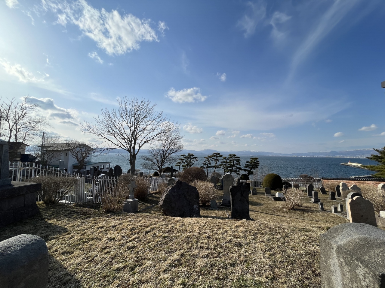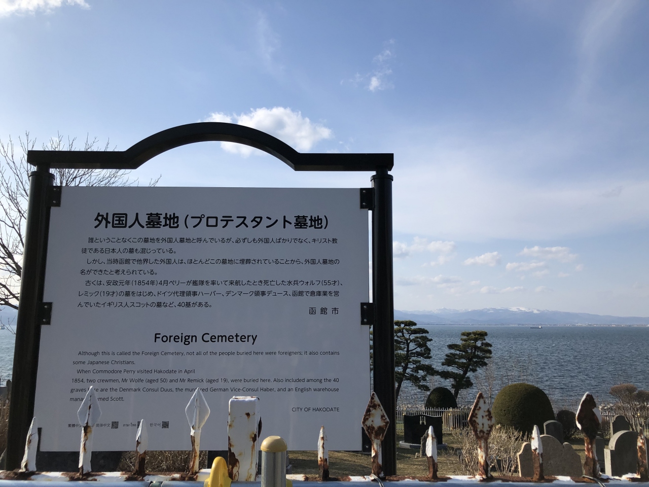 市電の終点「函館どつく前」から、坂を上って徒歩15分ほどの所です。広い一体が外国人墓地になっています。一口に外国人墓地と言っても、ロシア人墓地やプロテスタント墓地など、区画によって分かれていて、それぞれ特徴が異なりました。海を臨む眺めの良い場所にあり、異国の地で亡くなった故人の望郷の念に応えているような印象を受けました。