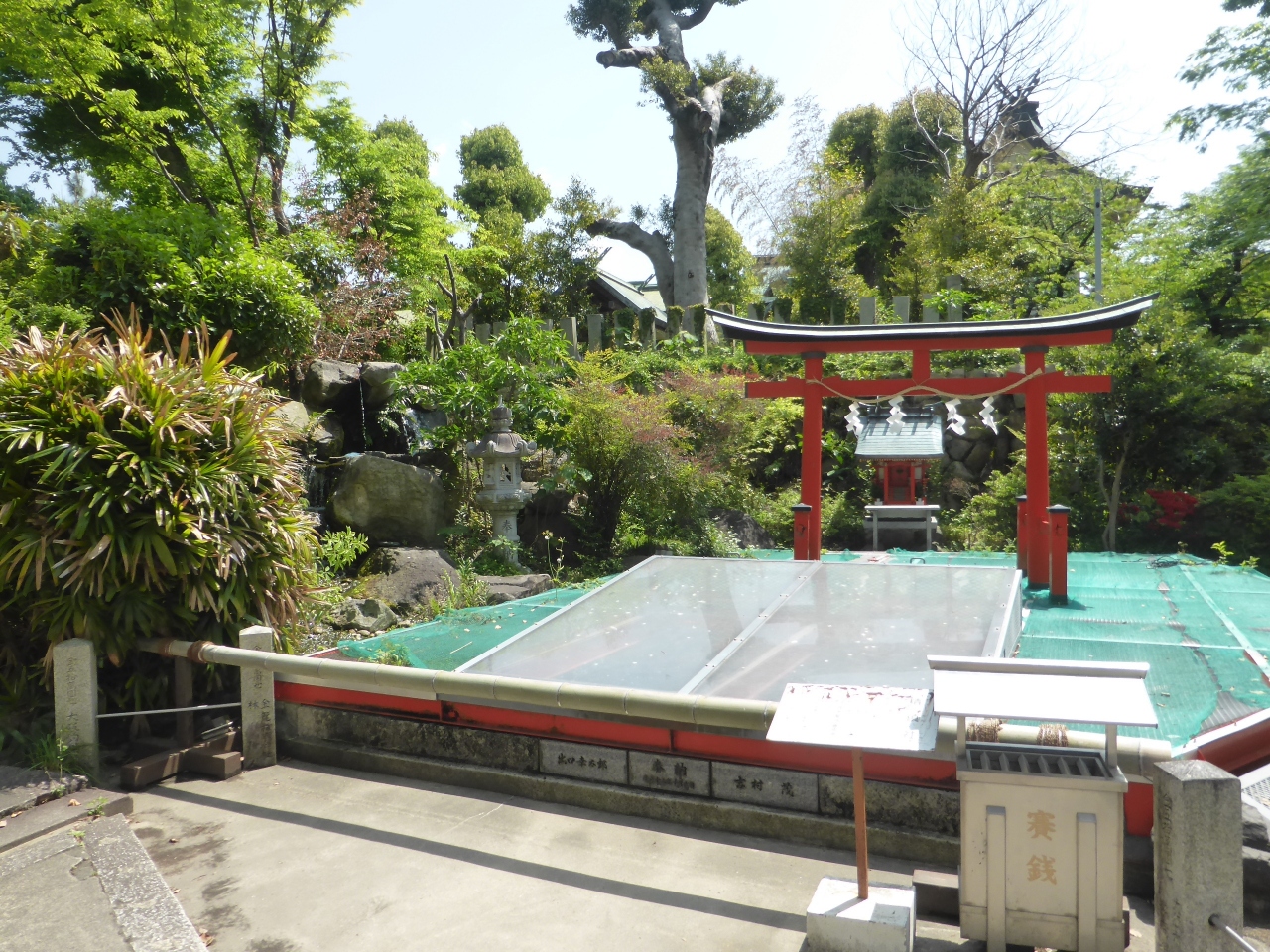 生国魂神社の境内摂社のひとつです。本殿、天満宮、住吉神社がある更に奥のエリアにあります。中央に赤い鳥居があり、どうやら緑のネットの下は池になっていて、鯉が泳いでいたんですね。近づいて見ないとわからないです。漁師や釣り人、鮮魚を扱う商人たちに信仰されています。