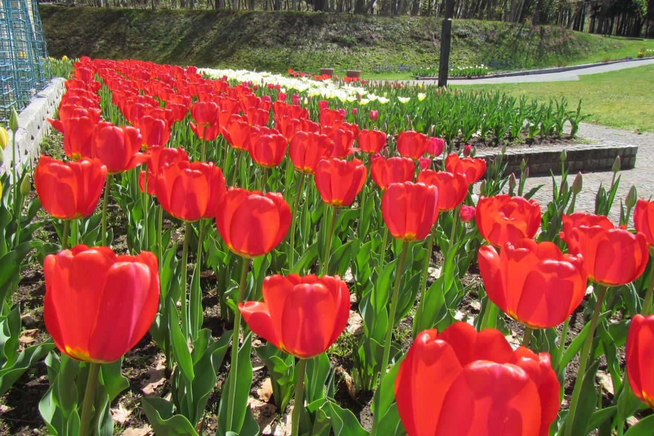 旭川駅方面から訪れやすい緑のセンター側の方では園路沿いが桜並木となっていましたが、他にも同時期、センター建物横にチューリップや、ロックガーデン内にシャクナゲなどが咲いていました。