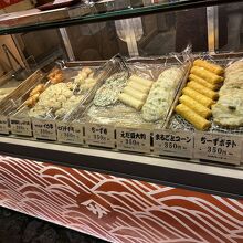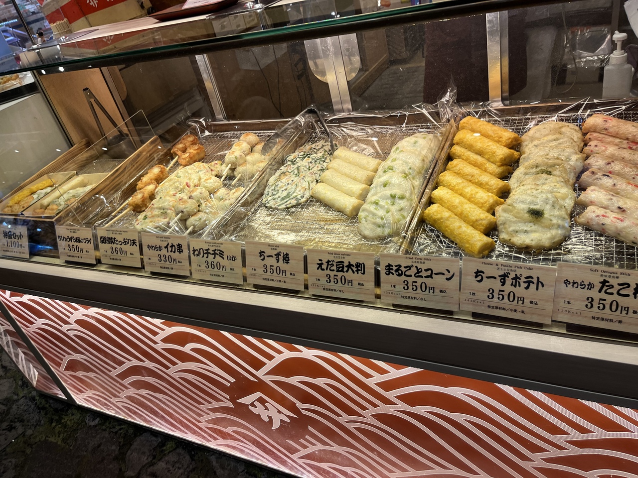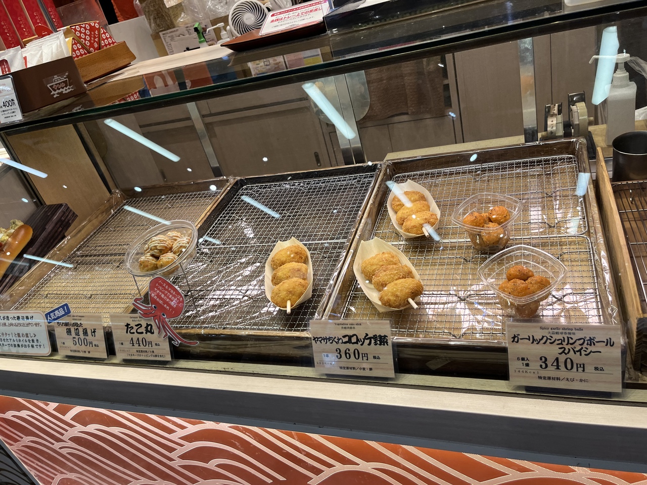 店内ガラスショーケースには、「やわらかイカ串」「えだ豆大判」「まるごとコーン」「コロッケ野菜」「ガーリックシュリンプボールスパイシー」など…いろいろありました。