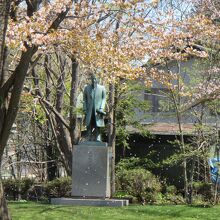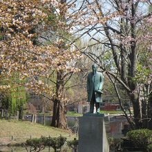 5月のゴールデンウィークの最後の方に訪れたところ、ちょうど常磐公園の桜が満開で、岩村通俊像の前にも多くの桜が咲いていました。