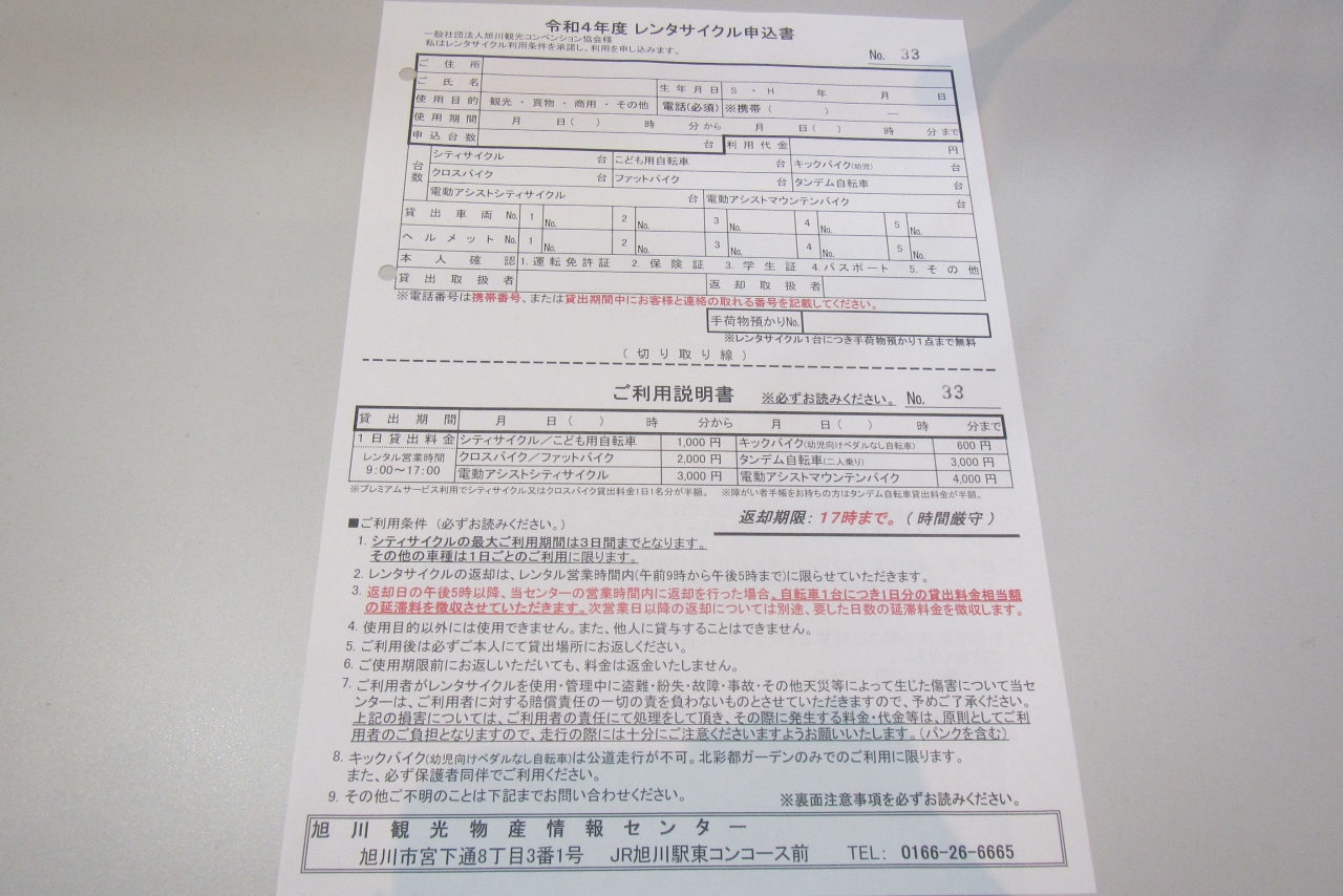 イオンと反対側の旭川駅東口改札を出て目の前にある旭川観光物産情報センター(9時~17時(6月~9月は8:30~))で4月末~10月の期間、貸出を行っています。