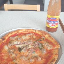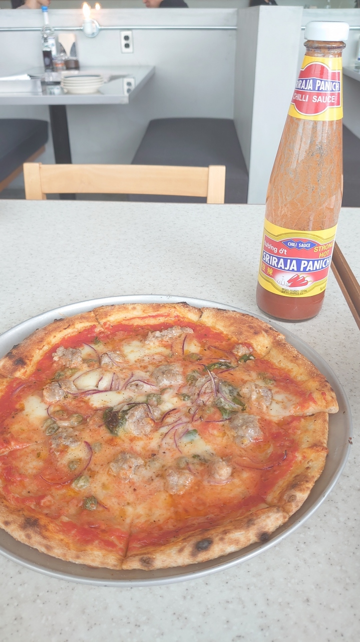 ポテトピザにしようとしたら、売り切れだったので、サルシッチャのピザと、グリーンサラダとラテにしました。