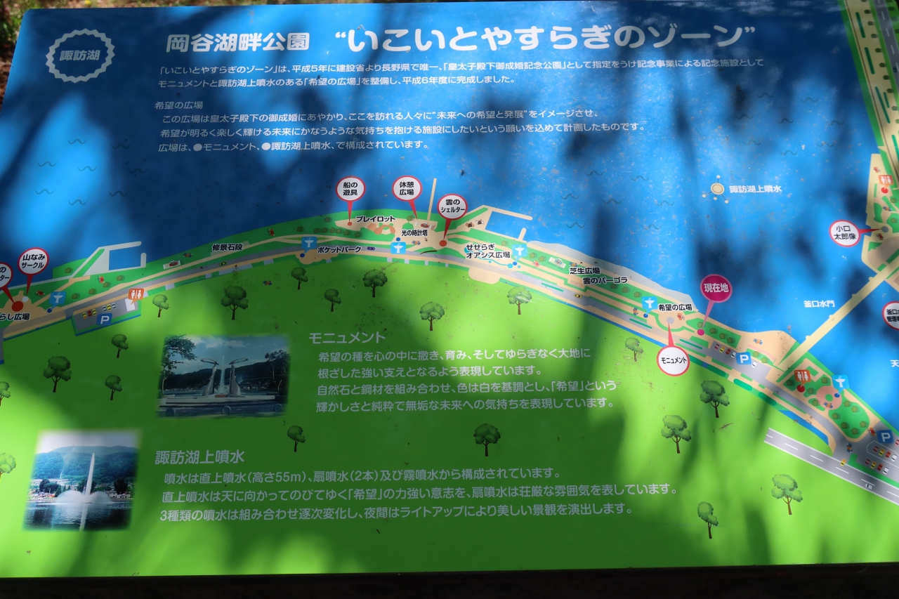 諏訪湖から流れ出る川が天竜川。その天竜川が流れる出る所に水門があり、その南北の湖畔に設けられた公園が岡谷湖畔公園です。昼寝をする人や、楽器の練習をする人や、ジョギングをする人など、市民に愛される憩いの公園となっています。勿論、諏訪湖も一望できます。