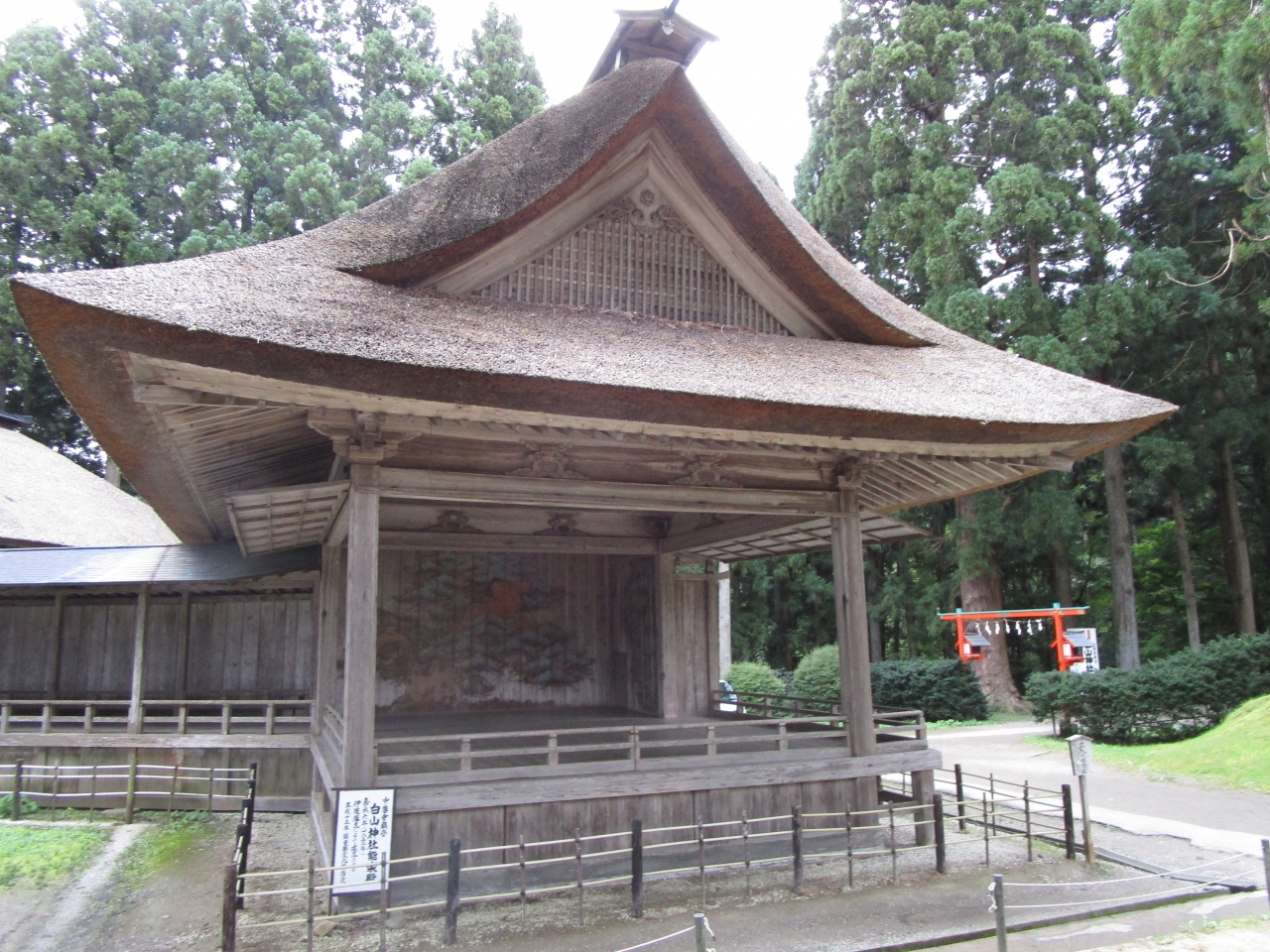 中心時の敷地内の奥まった場所にあります。現存する白山神社能舞台は、一度焼失したものが後に再建されたもので、重要文化財にに指定されているそうです。年季が入った木造の茅葺の建物ですが、それだけに厳かな印象を受けました。
