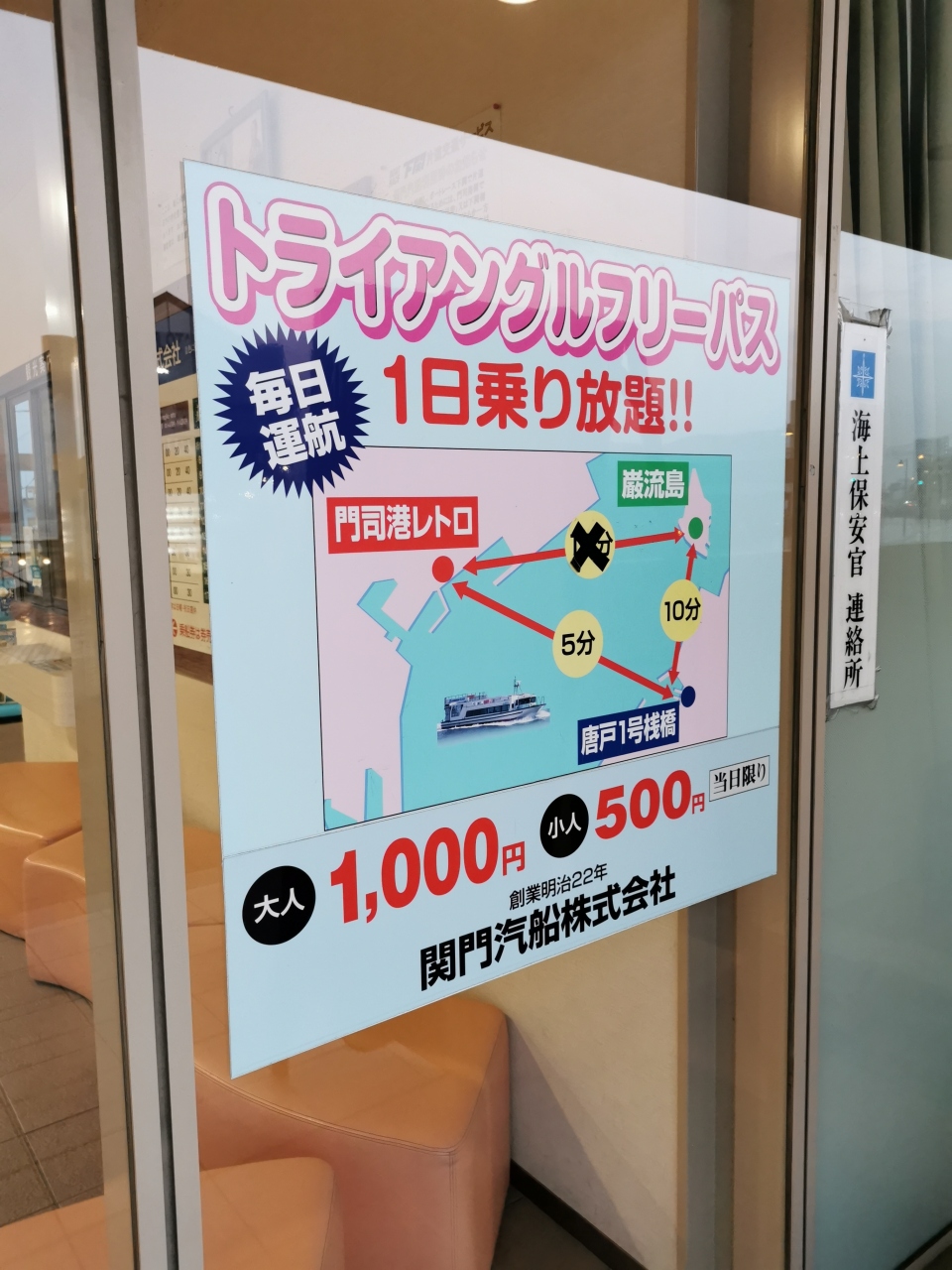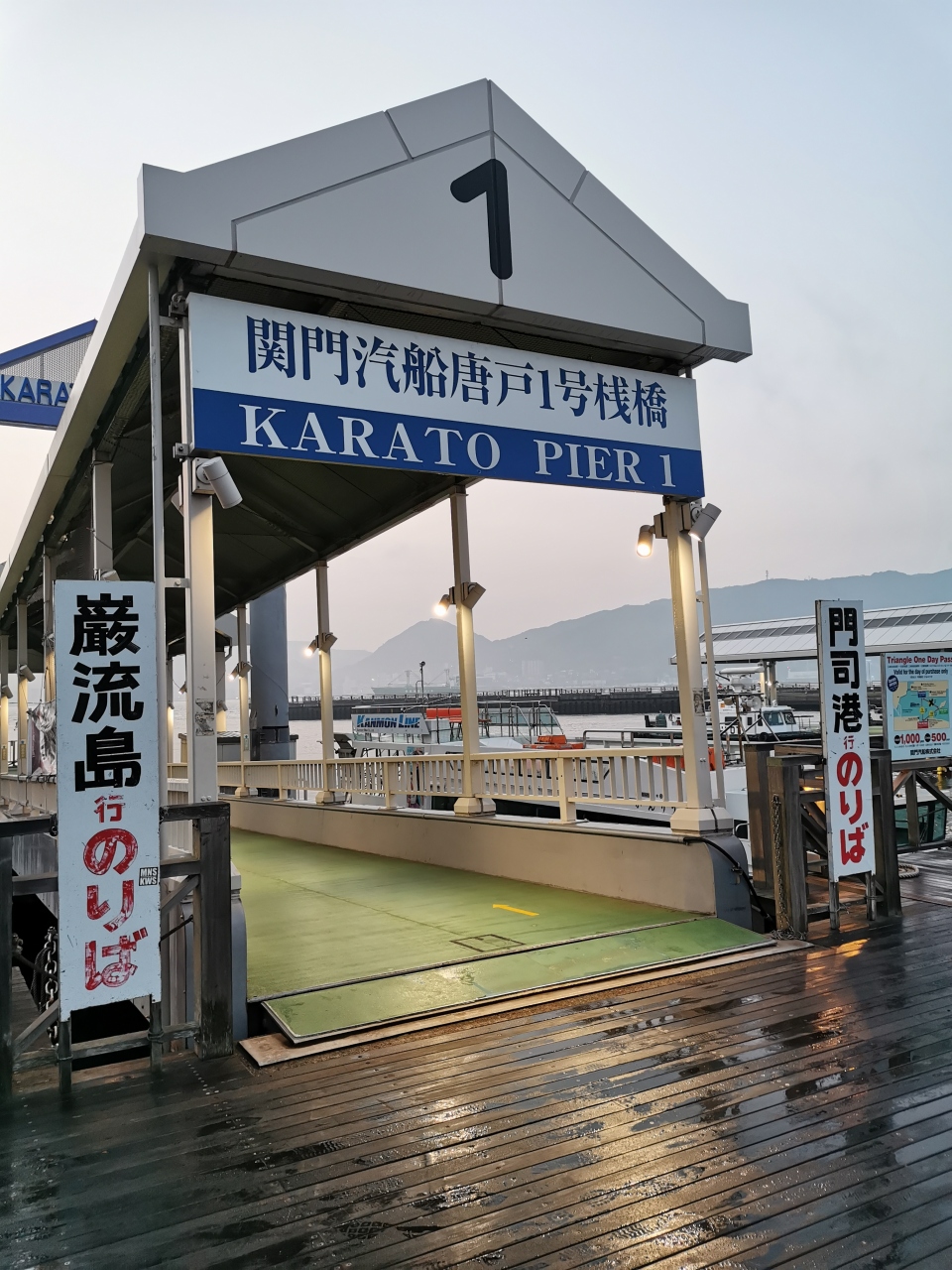 唐戸市場からしものせき水族館 海響館までボードウォークでつながっていて関門海峡が目の前。とても海が近く感じます。早朝でしたので、ゆっくりとウォーキングできました。唐戸ターミナル前の桟橋からはあの巌流島に渡る関門汽船のフェリーも出ています。便利な対岸の門司港にも行けるフリーパスも販売してました。
