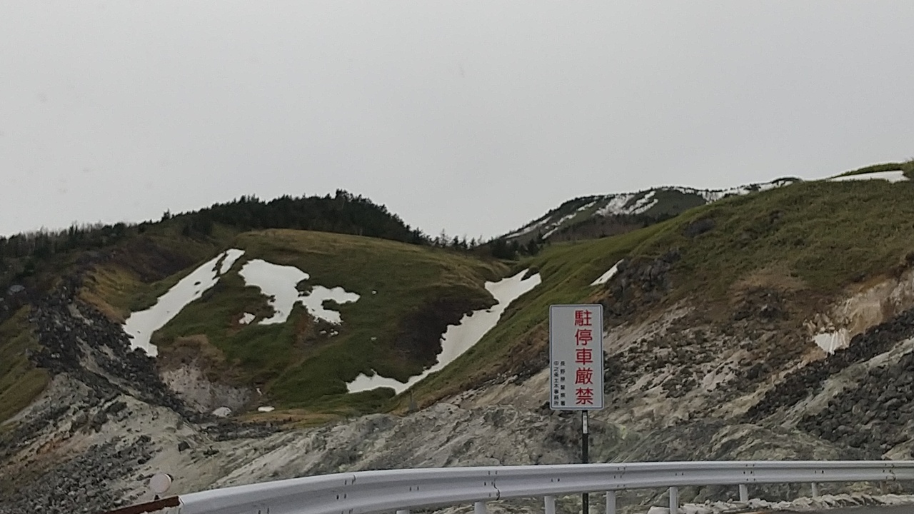 草津から万座温泉に行くため滞在中に何度も通った場所ですが硫化水素ガスが吹き出ている地域なので車窓から周辺の様子を見学するのみ。硫黄臭が漂います。駐停車厳禁の看板が出ています。