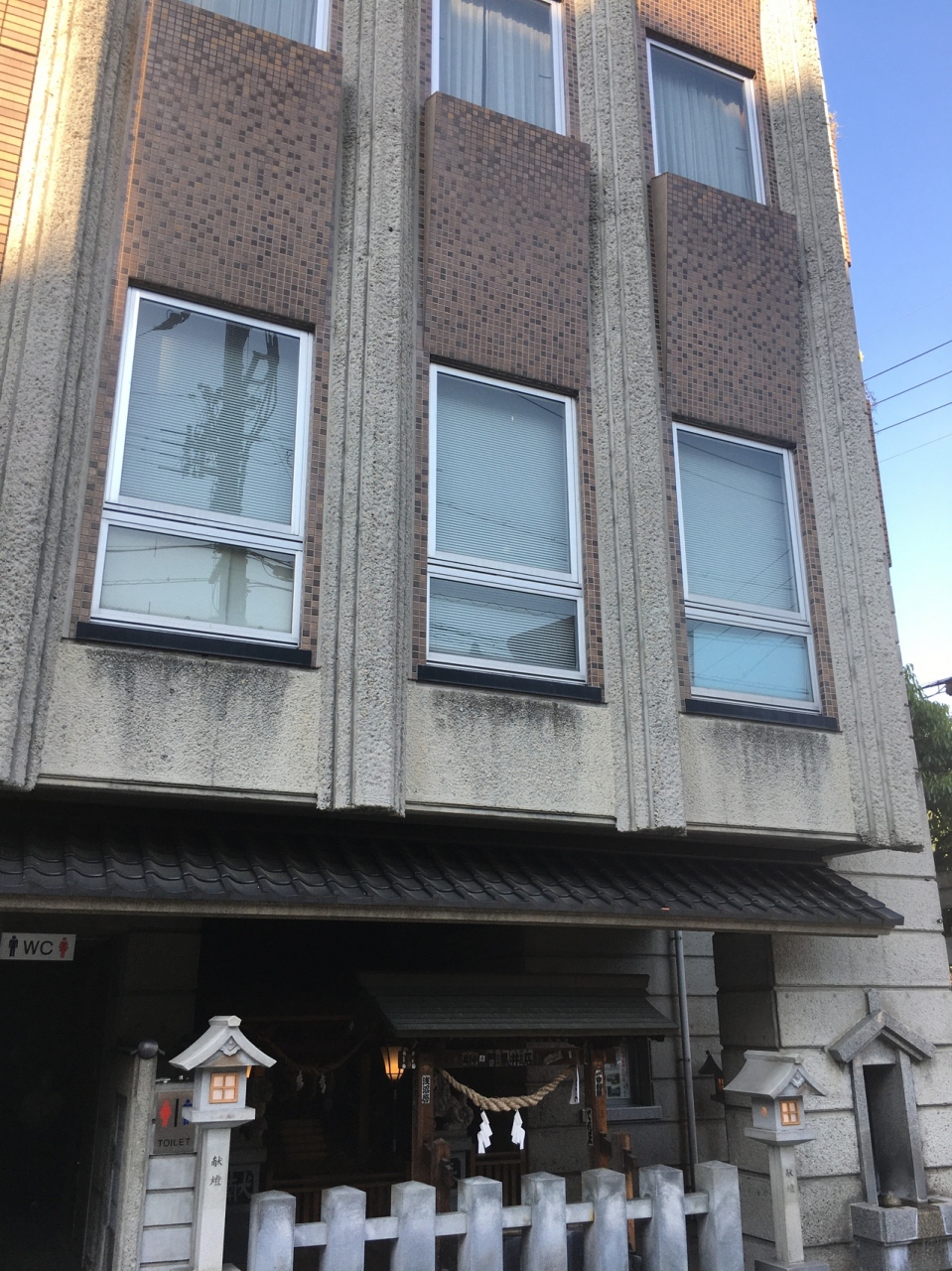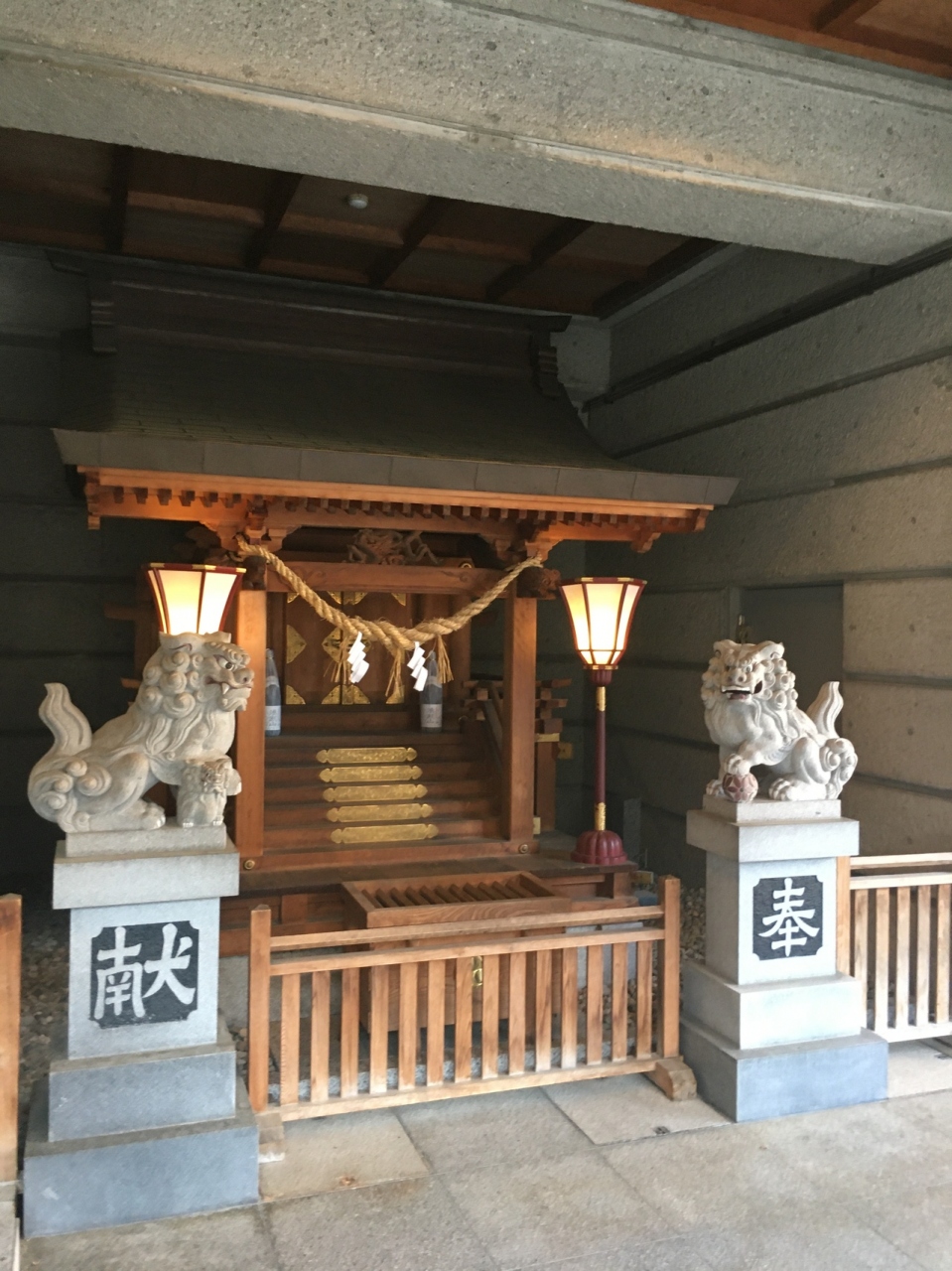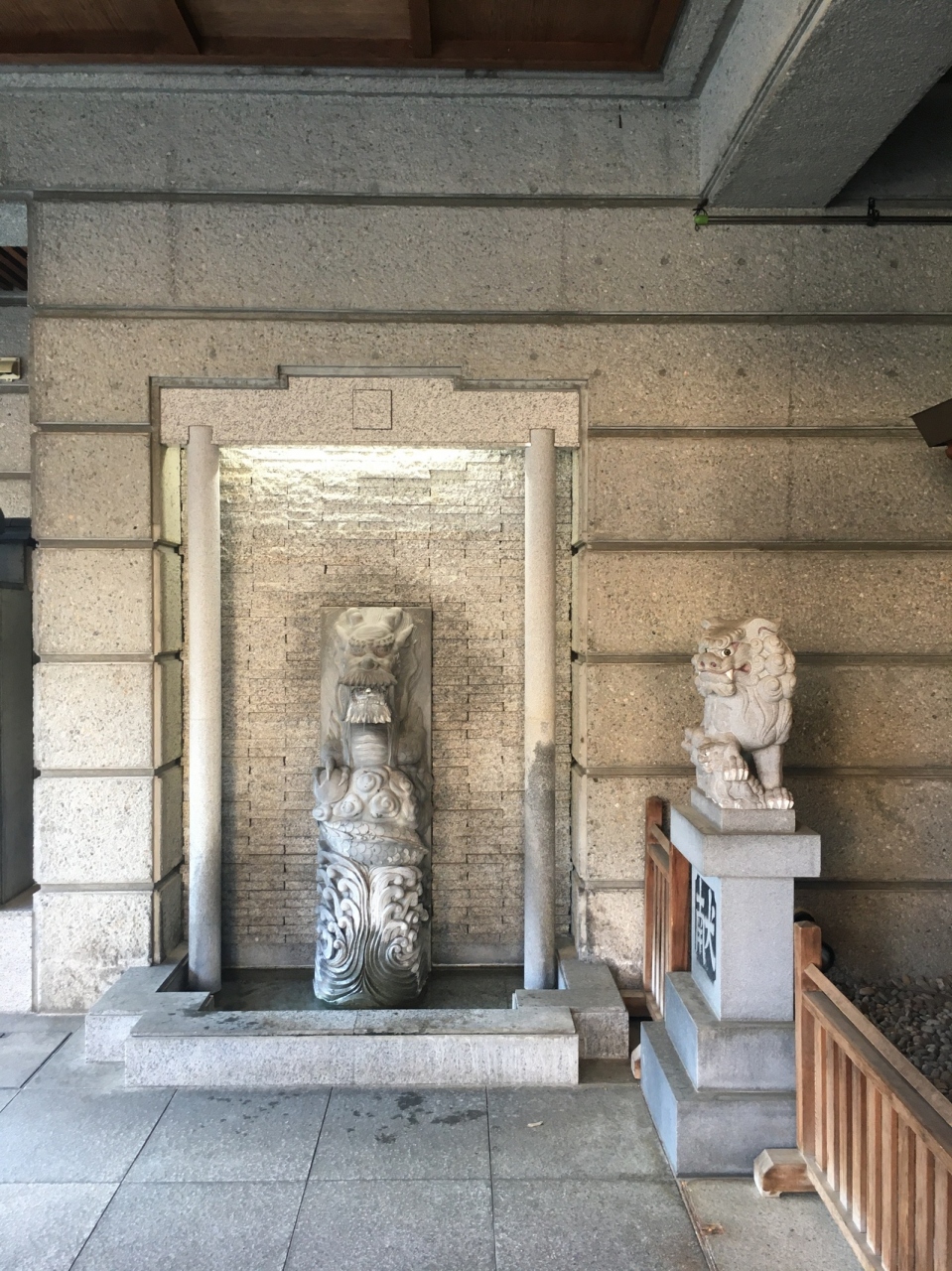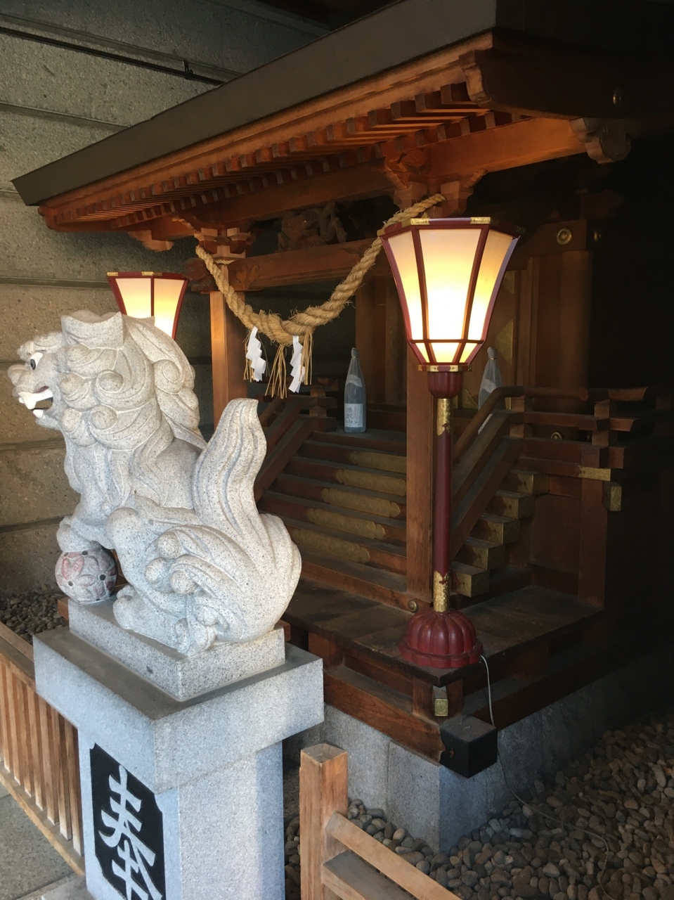 白鷺橋の横にあり下呂温泉街で最も人通りが多いところにありましたが、ビルの1階にあるので見逃してしまいそうな場所でした。ビルとくっ付いて鳥居があって境内はビル内です。獅子の像と祠がある神社らしくない雰囲気でした。