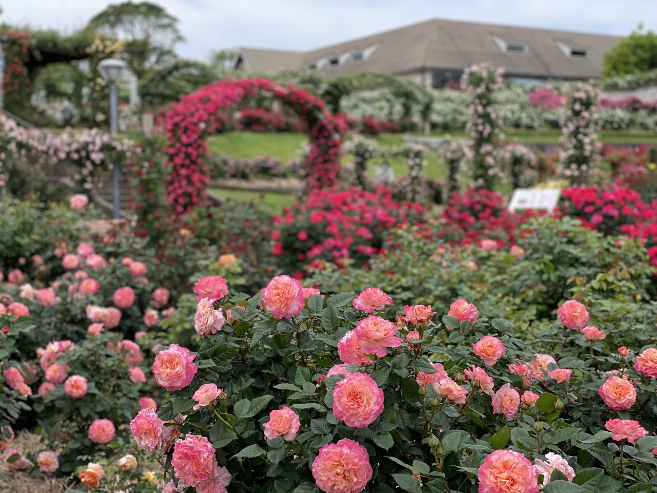 まだこれから開花のバラもありましたが、広大な敷地に様々な色彩のバラが見られて見事でした。80段の階段を登った霧島ケ丘展望台からは、開聞岳や高隈山が綺麗に見られました。ばら祭りは2022年は4月29日から6月5日まで開催中です。5月末からは紫陽花も見事なようです。