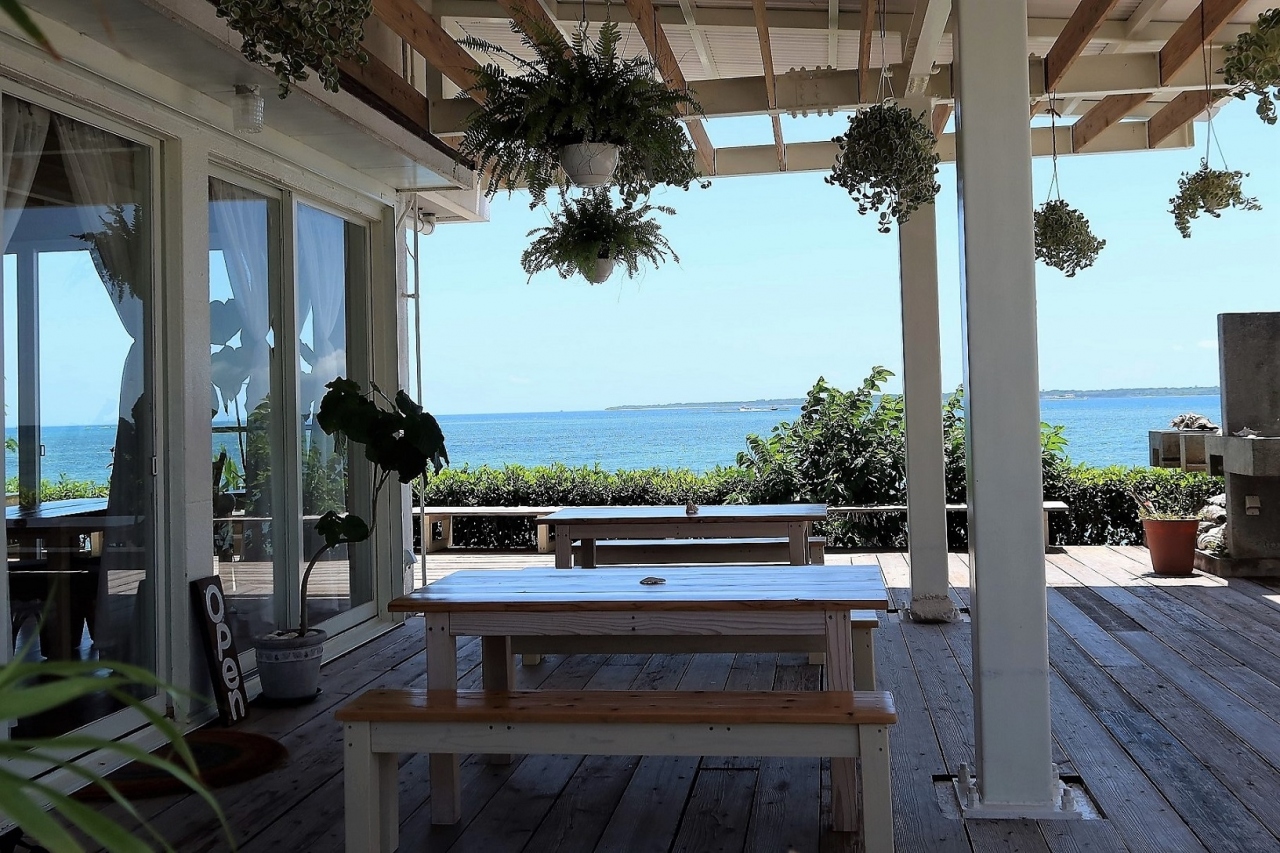 海沿いに建つカフェ。テラス席からは、一面、きれいな海、向こうに竹富島の眺め。