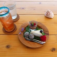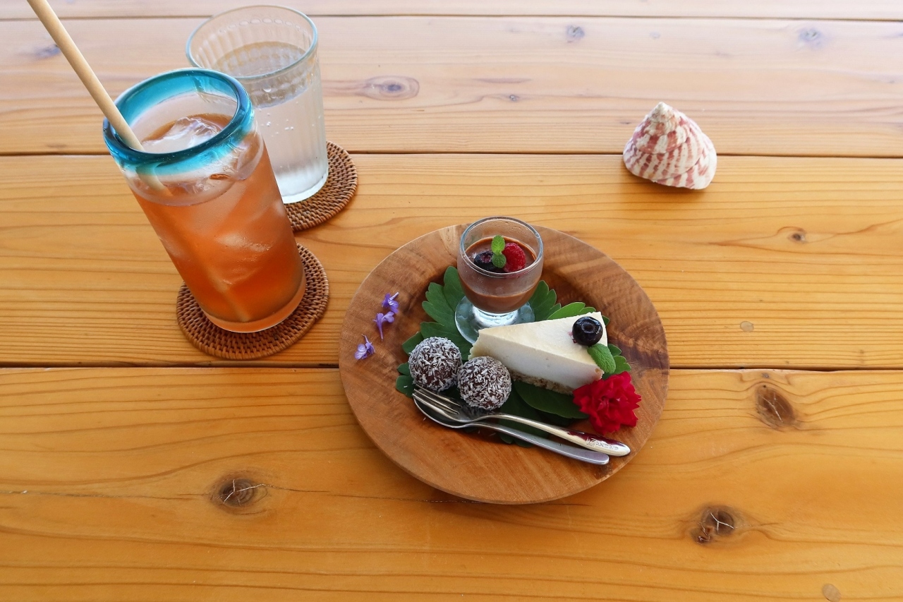この美しい眺めを前に、スイーツプレートと月桃茶をいただきました。スイーツプレートは、ローチーズケーキ、チョコムース、ローチョコトリュフのセット。それぞれ小さいサイズのRawスイーツなので、負担を感じることなく、美味しくいけました。完食、いけちゃった8-> 中でも、チーズケーキは、カシューナッツとココナッツの入った、風味の良いベースに、レモンの効いたスムースな生地で好み。