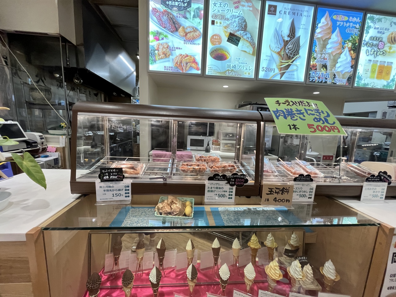 ほかには、「ソフトクリーム」 や 「たまり醤油の唐揚げ」「五平餅」「肉巻きにぎりめし」