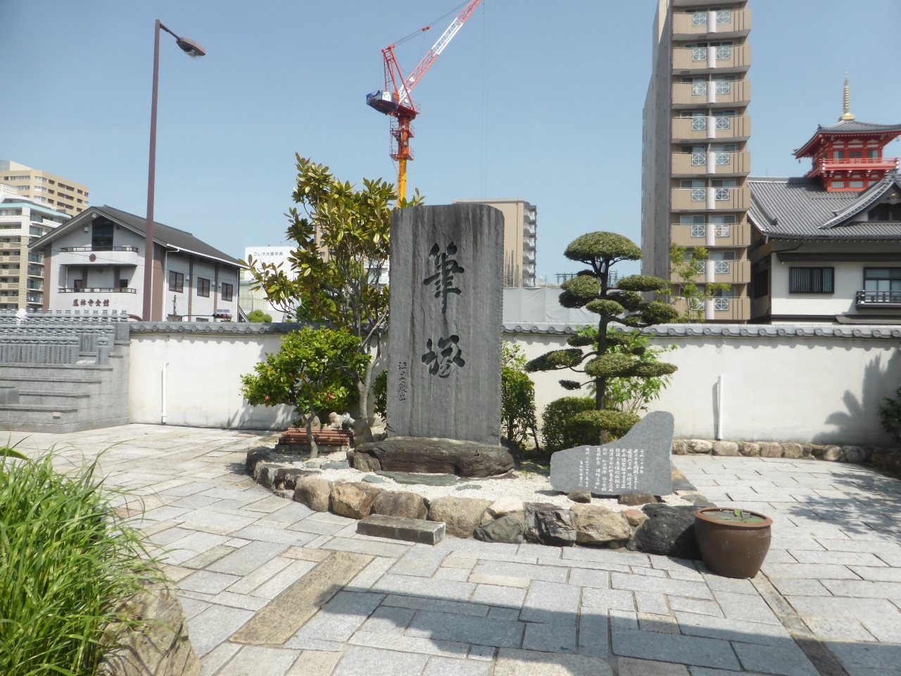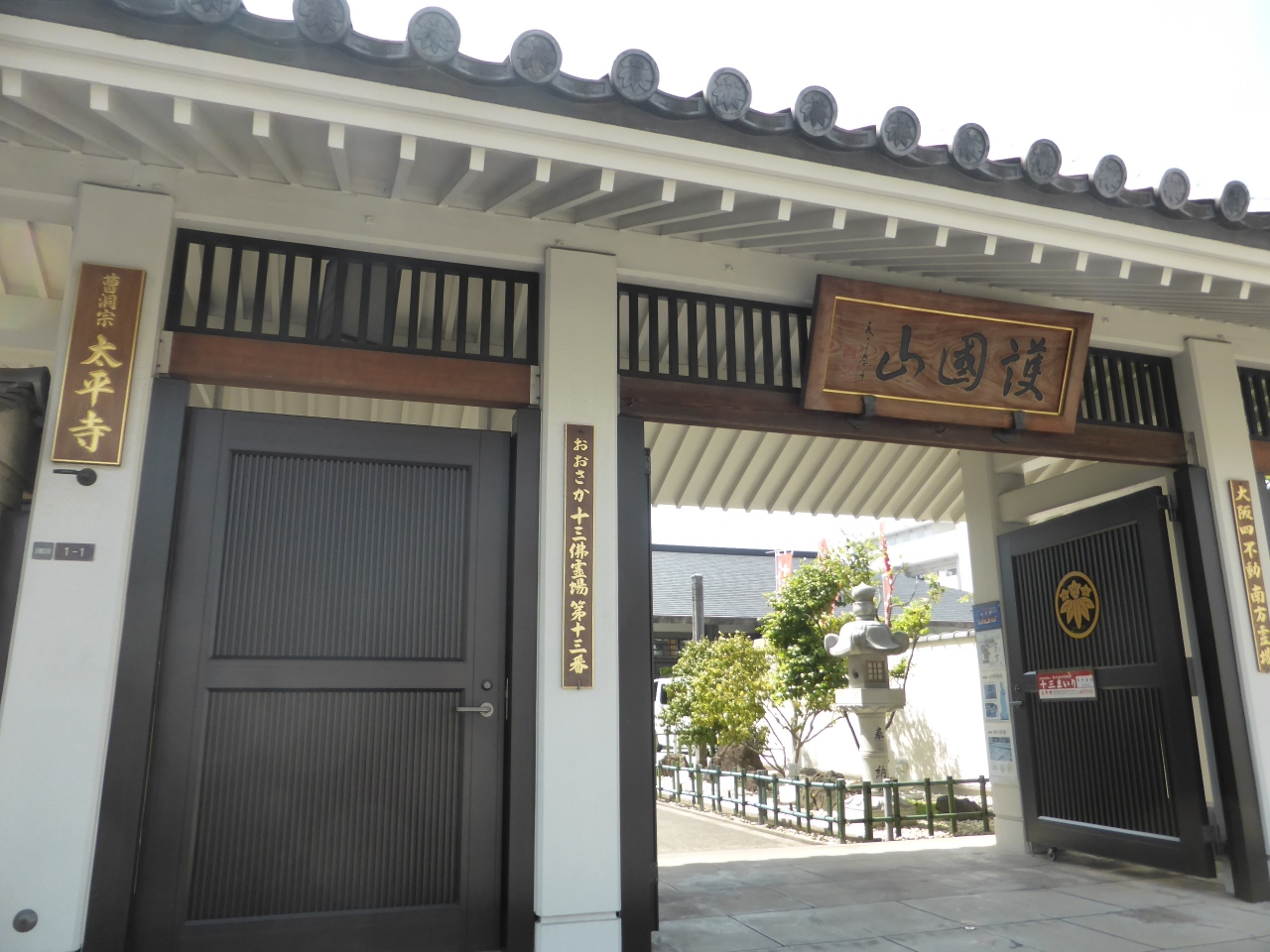谷町筋に面して建つ曹洞宗の太平寺。「十三まいりのお寺」として、おおさか十三仏霊場第十三番・大阪四不動南方霊場として人々に親しまれています。境内は広く誰でも気軽に入ることができます。入口付近にはマニ車(経車)、奥へ行くと諸芸上達を虚空蔵菩薩に祈願して建立された針塚・筆塚・茶筅塚があります。