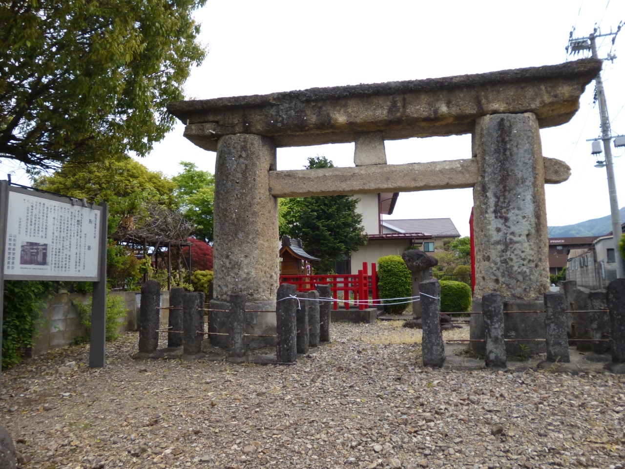山形市の市街地から少し南東へ行ったところ、鳥居ケ丘の住宅に囲まれた場所に、石鳥居があります。高さは3.5mくらいの鳥居で、その様式の古さから平安時代のもので、日本最古のものと考えられていて、国の重要文化財に指定されています。幅に対して、高さが低いことが、古い様式の特徴だそうで、初めて見ました。