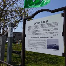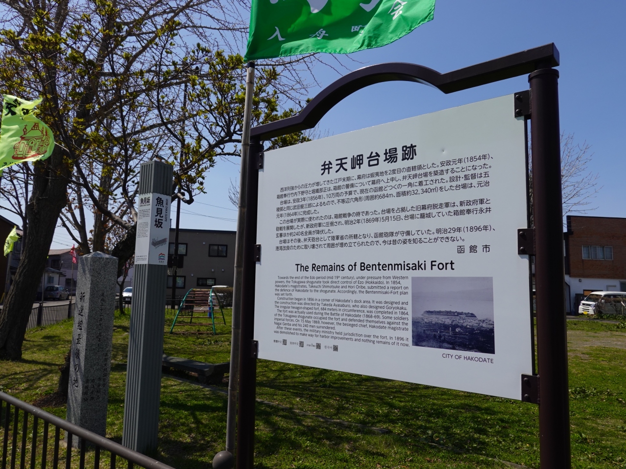 函館市電終点「函館どつく前」停留所のすぐ前にある入舟児童公園に、「弁天台場跡」の案内板があります。弁天台場は、箱館湾口の防備のため安政年間に築かれた軍事要塞です。案内板には写真がプリントされており、当時の様子を思い偲ぶことが出来るのが良いと思いました。