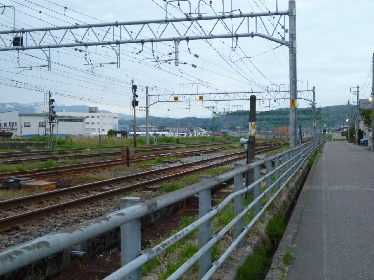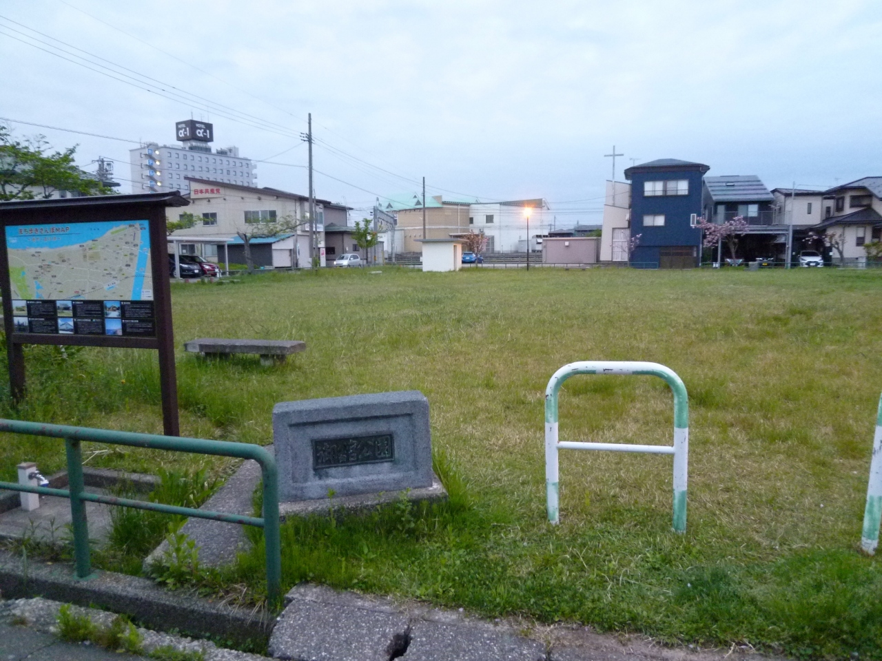 駐車場はなく、宿泊したアルファワンから徒歩で行きました。北条氏康に敗れた上杉憲政のために造営した東京ドーム1.6倍の館跡で、公園はその中心部を「御館」とつけたそうです。案内板にありますが、JR線路沿いから春日山が見えます。