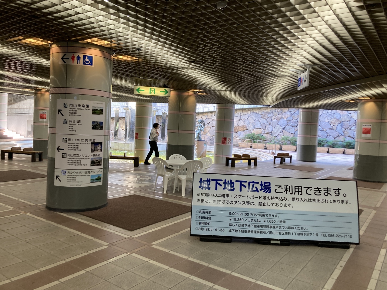 県立美術館に行くべく、岡山駅から市電に乗って城下で降りる。広い道路を渡るのに安全な様に地下道があり、降って行くとそこには明るい広場があり、市民の憩いの場となっている。地下とはいえ、開口部から陽の光が差し込み、健康的でそこここにベンチやテーブルがあってほっと一息つける。