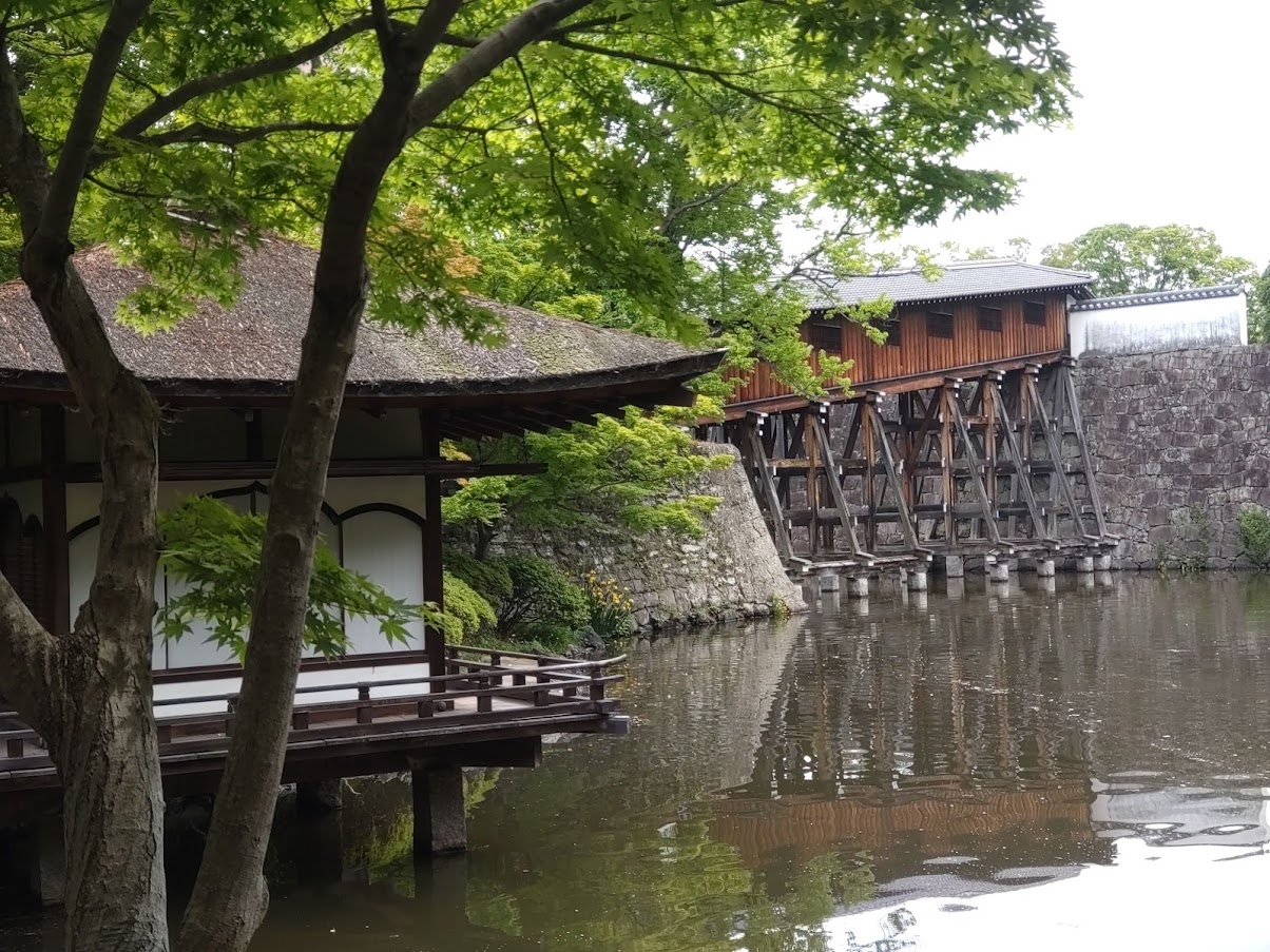 お城を取り囲む濠というと、敵の侵入を防げるように作るのが一般的ですが、その端のここだけは日本庭園になっていて珍しいと思いました。真ん中の橋に立って眺めると、お堂や渡り廊下などの構造物があって奥行きを感じました。
