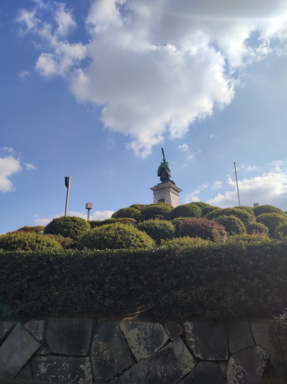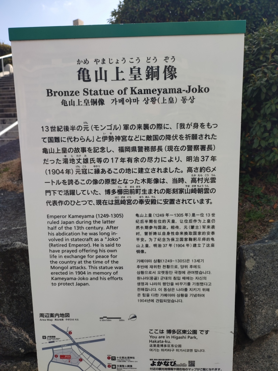 JR吉塚駅の近くの県庁など官庁があるエリアにある公園です。公園の中央部の小高い丘の上にある亀山上皇の像がなんといってシンボリックです。見どころはこの像くらいで基本的には憩いの場のよう感じで、近くのオフィスの人は昼食時はこちらで食べたりするのに良さそう。