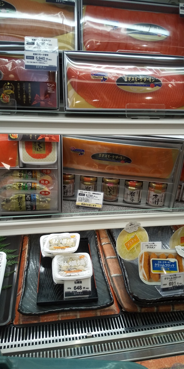 その昔製紙会社が作ったスモークサーモンの老舗メーカーの大丸札幌の店です。ほっぺたうんの奥にあり会計は食品の集中レジになります。色んなスモークがあり鯖の燻製まてまあります、国産サーモンよりチリの輸入サーモントラウトを使ったスモークは味はほぼ同じで値段はお得