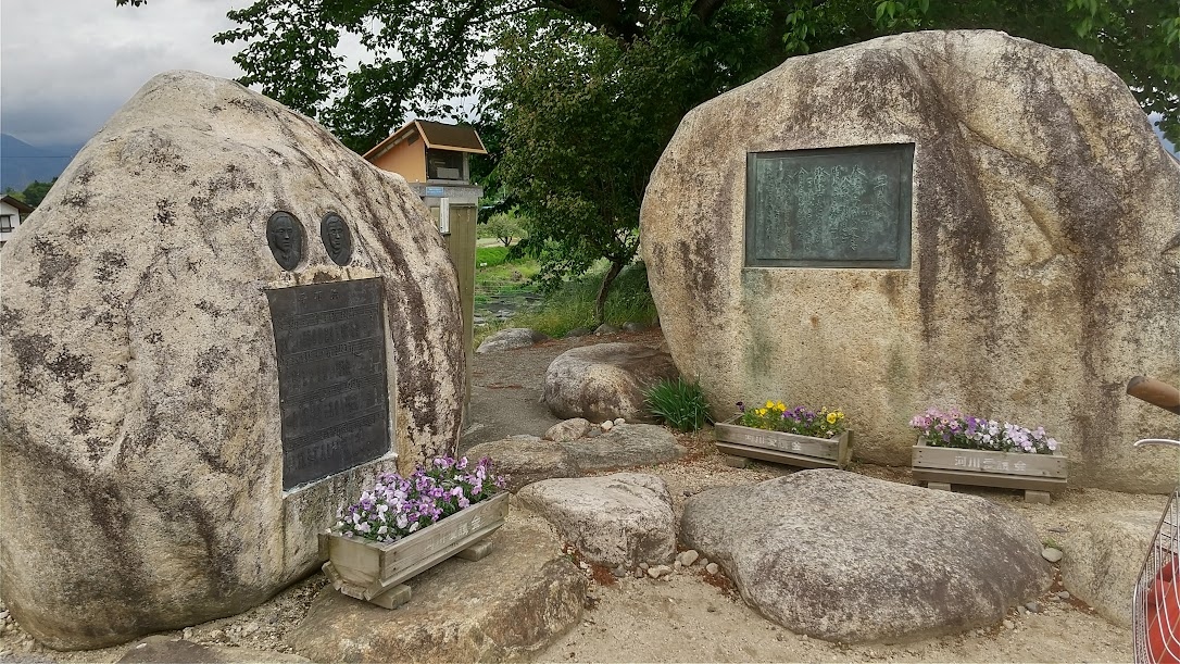 安曇野の雪解け時期をイメージして作られた歌曲の早春賦を記念した碑が穂高川沿いにあります。穂高駅から大王わさび農場に向かうサイクリングコース上なので、まわりのわさび畑と川の清流を眺めながら走ると見つけられます。穂高駅からまっすぐ大王ワサビ園に行くルートではここは通らないので、川沿いのルートをとりましょう。まわりにワサビ田がひろがり良い景色です。