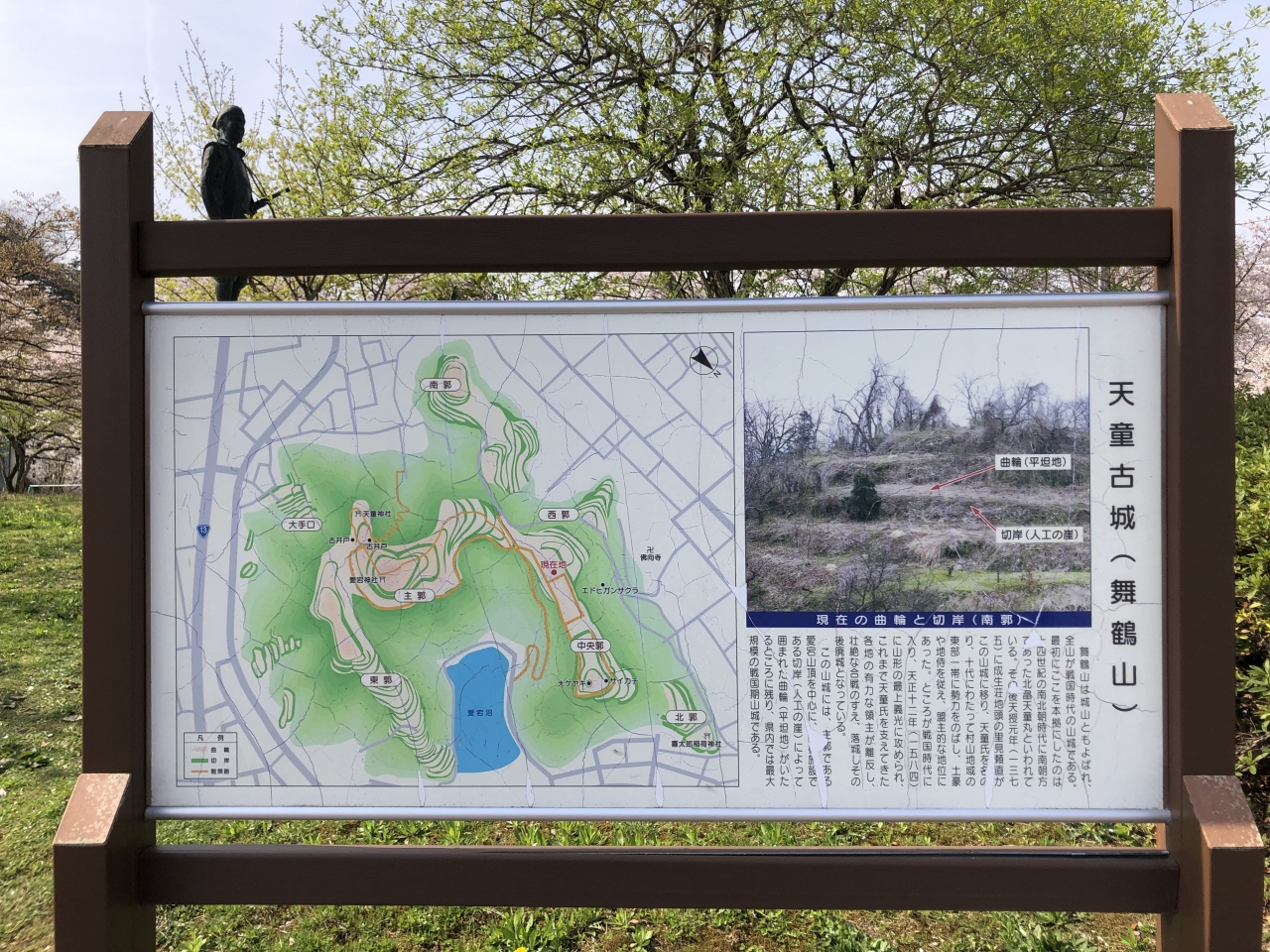 舞鶴山全体が城跡になっています。南北朝時代に築かれた城で、1584年には廃城になったそうです。建物などは残っていないので、案内板がなければ城跡だとはわかりませんでした。駐車場前に案内の看板が建てられていて、そちらを見ると天童城の歴史がよくわかります。