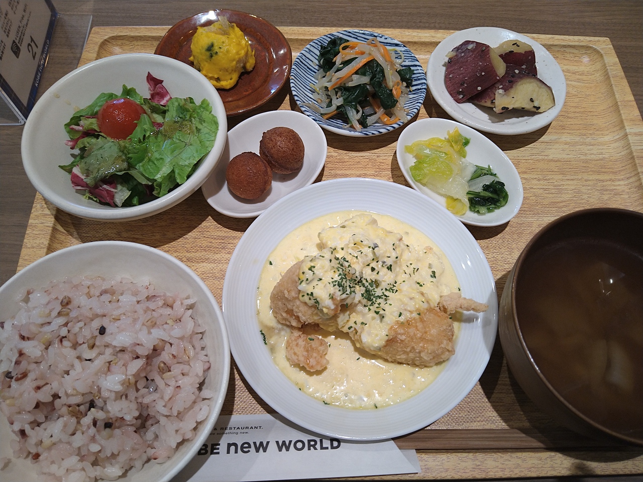 自家製ふわふわ神戸豆腐ハンバーグ、淡路どりのチキン南蛮自家製タルタルソースなどたくさんの種類からメインを選べるランチセットはよかったです。1,500円以内で好きなメインと、選べるご飯(十五穀米、白ごはん)、選べるスープ(野菜たっぷりお味噌汁、淡路玉ねぎスープ)、五品目野菜のサラダ、副菜3種、お漬物付きです。チキン南蛮をいただきましたが、チキンは意外とあっさりしており、タルタルソースが好きなタイプのタルタルで美味しかったです。