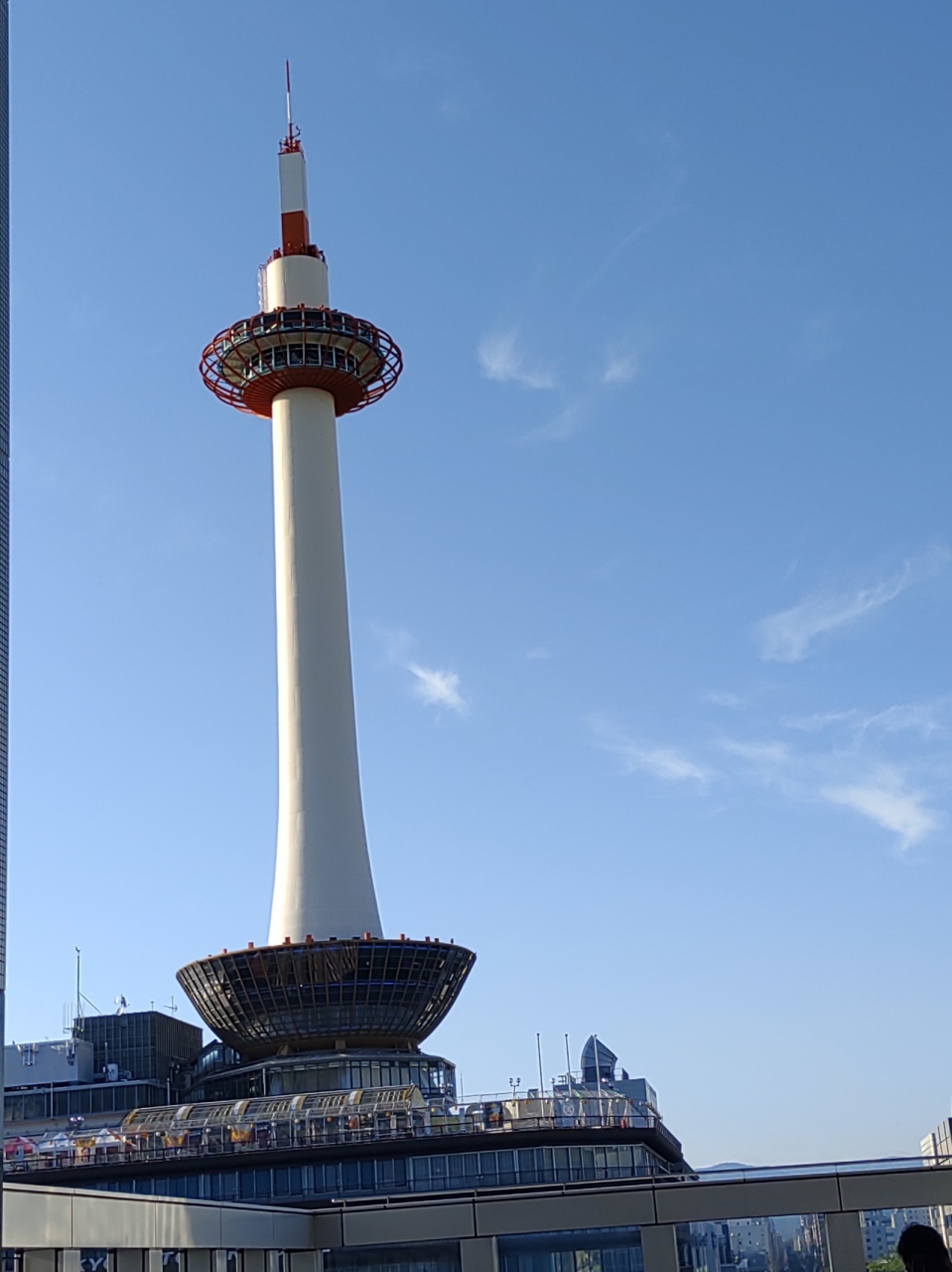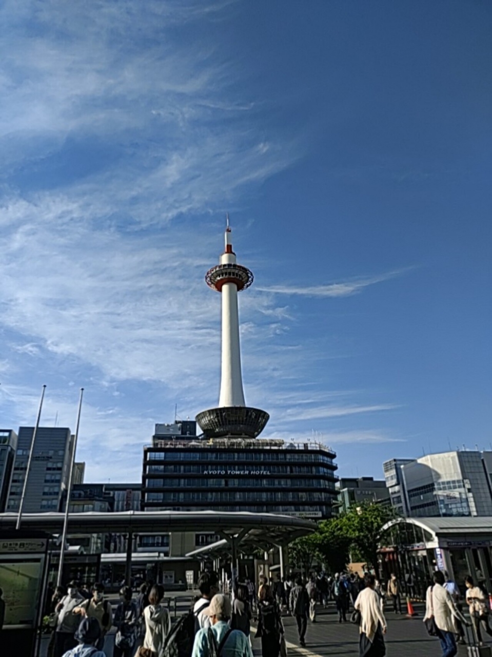 京都タワーを見ると、京都へ来たという実感が沸いてきます。晴天で、暖かい日でした。観光客の方々もたくさんいらっしゃいました。いつものように、タワーは、温かく旅人たちを迎えてくれていました。笑顔になれました。