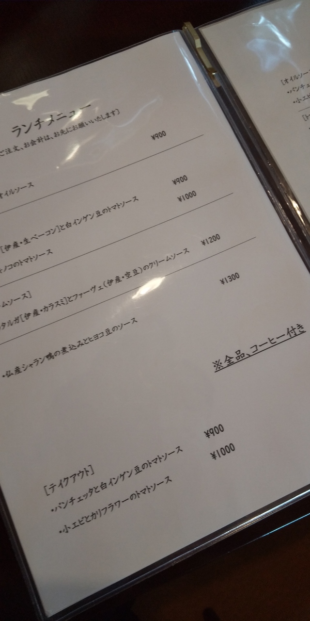 最近はパスタ専門のイタリアンレストランに業態を変更したようです。お店には入りメニューを見てオーダーし先に会計を済ませるシステムです。コスパは高くだいたい1000から2000円のランチメニュー、パスタにはコーヒーがつきます。静かで小さなパスタハウスです