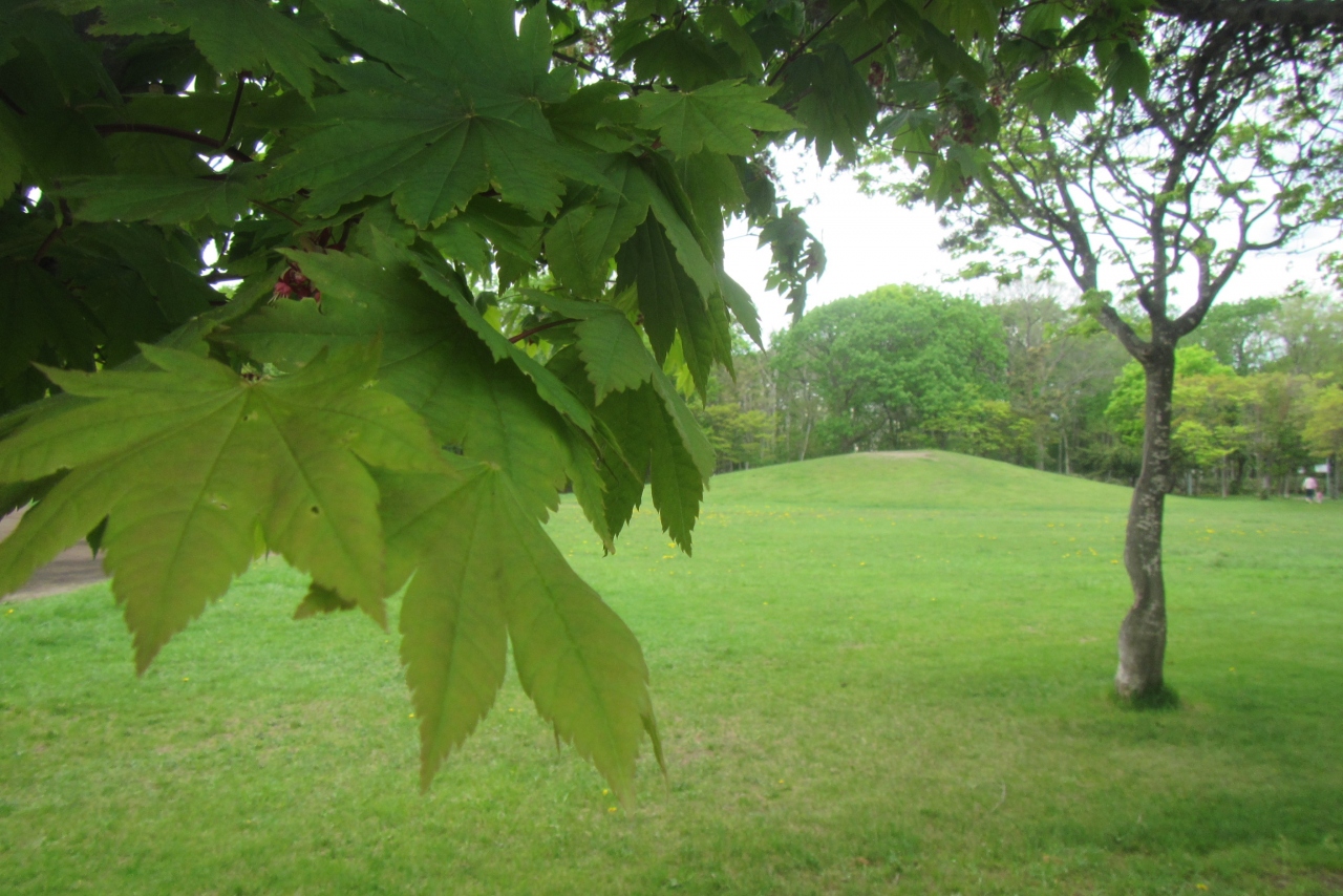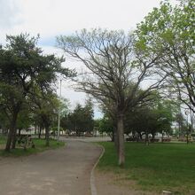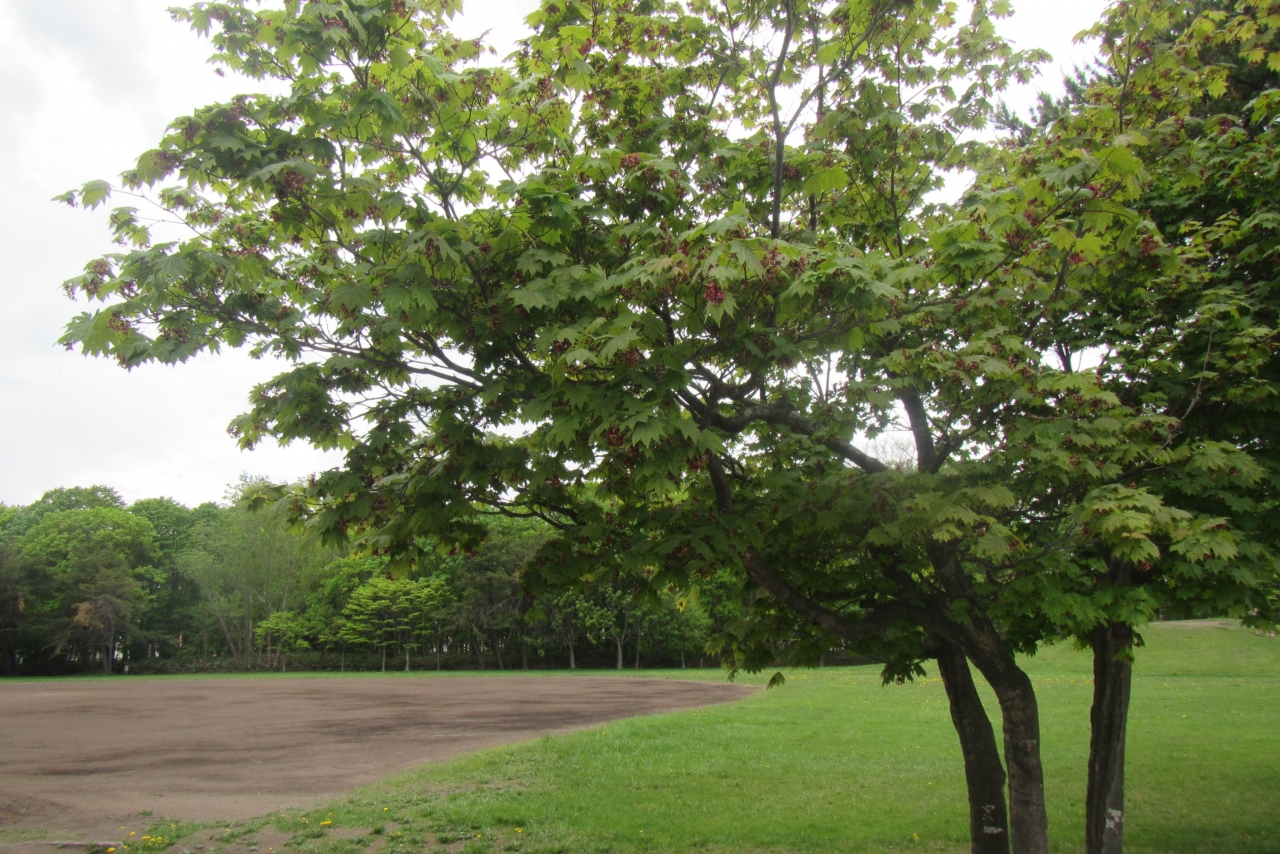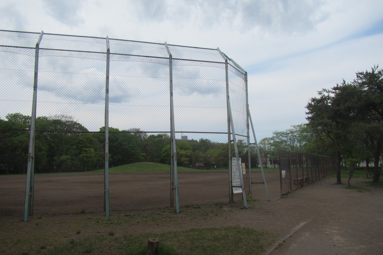 石狩市の花川の住宅地に囲まれるようにしてあり、野球場のグラウンド、草地の広場、テニスコート、公衆トイレなどがある公園で、防風林に面しているせいもあってか、比較的緑豊かな印象です。