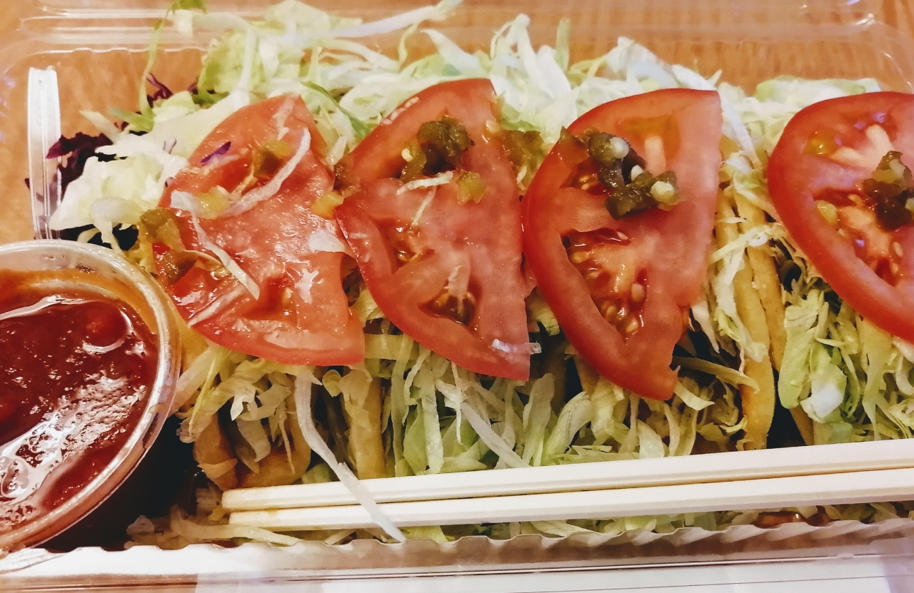 野菜もお肉もタップリのタコスにピリ辛のサルサソースが美味しかった。