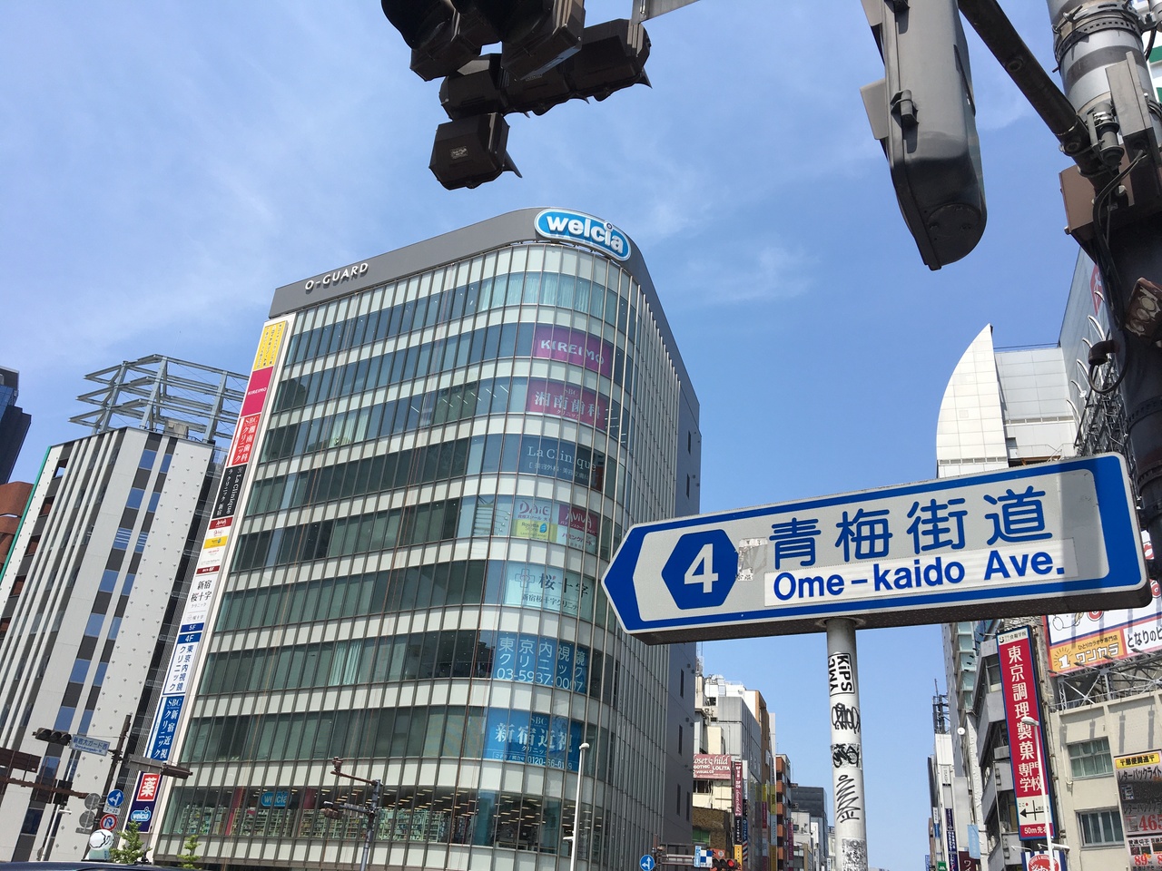 JR新宿駅西口を出て、西新宿方面へ歩いている途中で青梅街道の大通りにぶつかりました。青梅街道は、新宿区から東京都青梅市を経由して山梨県の甲府市にまで至る道だそうです。新宿の辺りの青梅街道は車の通行量も多く、とても賑やかな通りです。