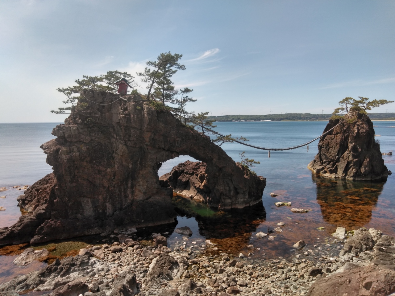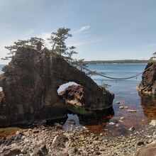 海岸沿いにあります。道路の反対側に廃業したお店があって、その駐車場に無料で停められます。2つの岩が並んでいて、1つの穴には大きな穴があいていたり、とても見応えがあります。海も底が見える程、水が澄んでいました。