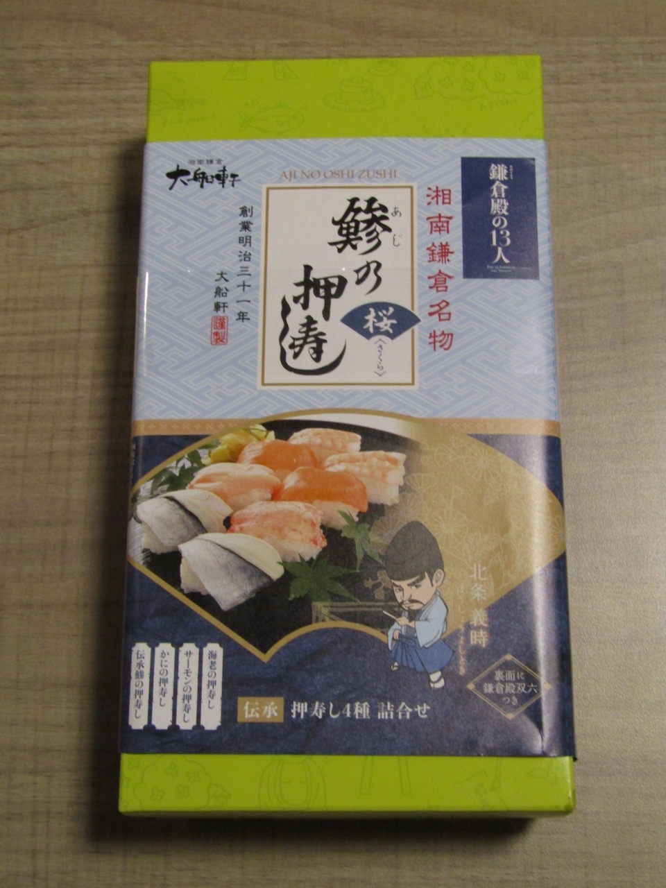 今回は大船の「鯵の押寿し」を購入、鯵のほか海老や桜鱒も入り酢の効いた美味しいお寿司でした。