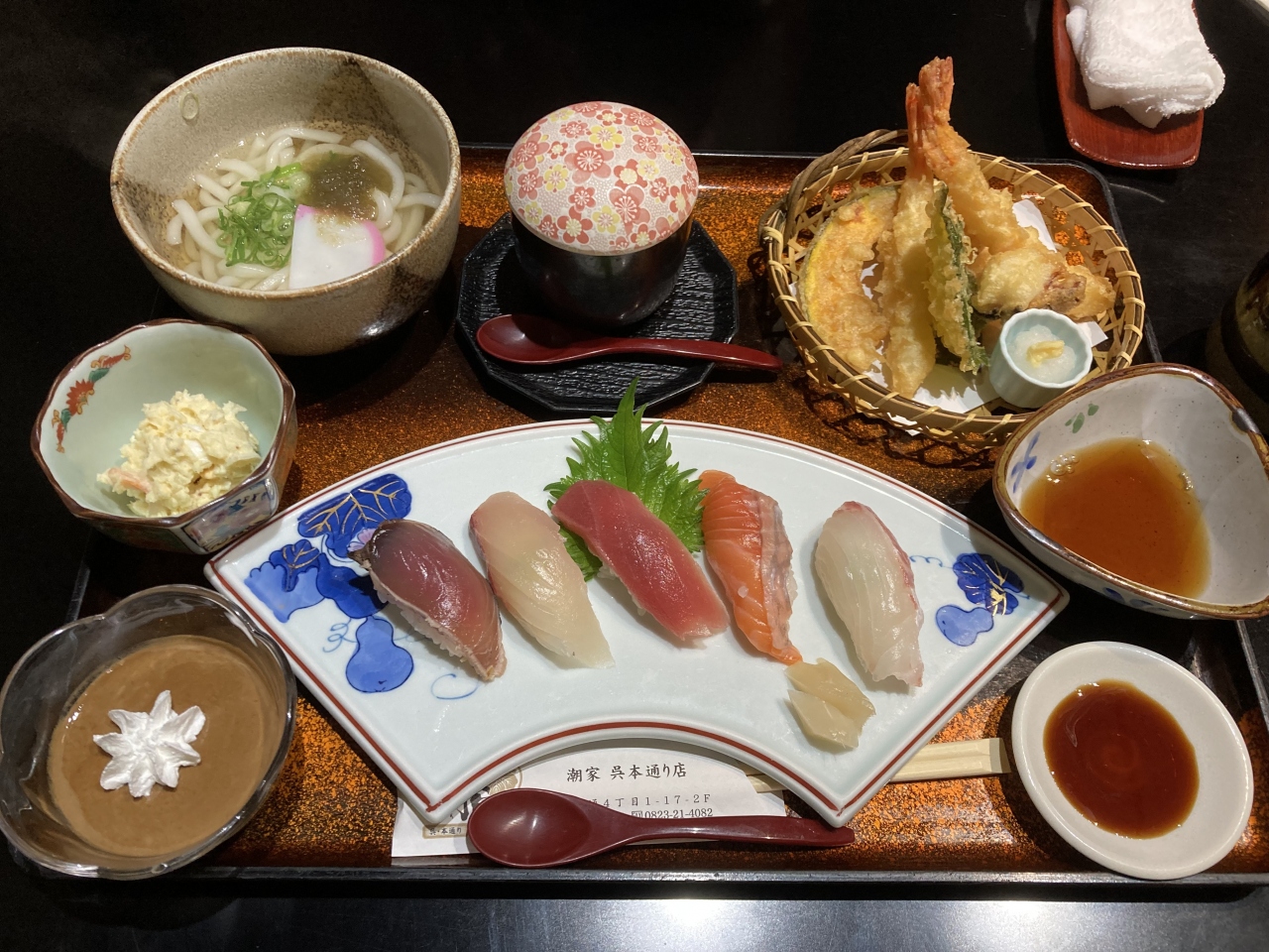 気に入った店がなく、熊野にも無く高速を走って呉の中通りにある潮家に電話していきました。コロナ禍前は安浦にある総本店は豪華で美味しので行ってましたが本通りは初めてです。呉の中心部ですが無料駐車場がないので行き難いです。日曜日とあって人出はなく休業している店舗もなく、個室で天刺御膳と天プラ寿司うどん御膳を食べました。