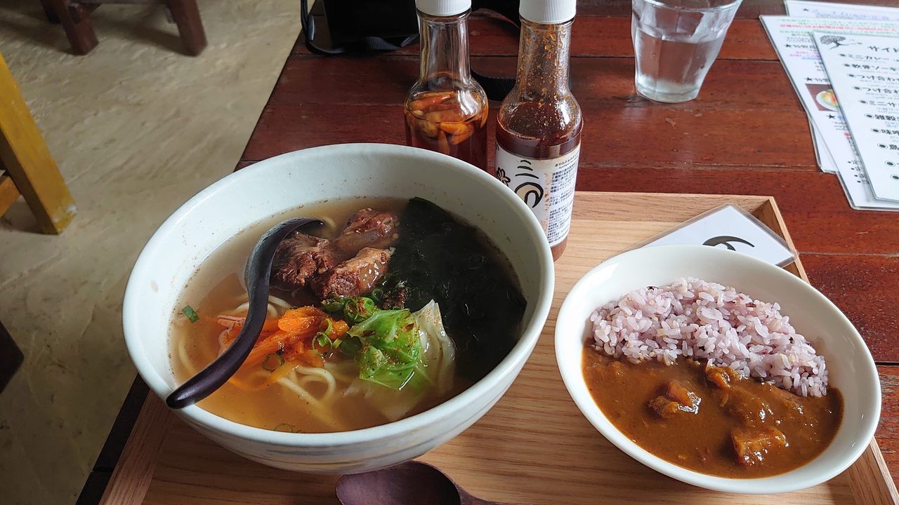 すぐそばのみんぴかで、かき氷を食べたあとに、ランチで伺いました。テーブルにつくまでは、ラフテー定食にするつもりやったのに、注文したのは何故か、ミニカレーにソーキソバ。ソーキは、とろとろで噛まなくて良いくらい柔らかいです。ミニカレーは、やっぱりミニやね。そんなに辛いカレーではありませんでした。波照間島でのランチでオススメです