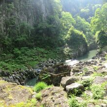 真名井の滝から遊歩道を歩いて行くと、しめ縄をされた200トンの大きな岩が見えてきます。丁度仙人の屏風岩の五ヶ瀬川を挟んで向かいです。悪行をはたらいていた鬼八が自分の力自慢をするのに投げた岩と言われています。