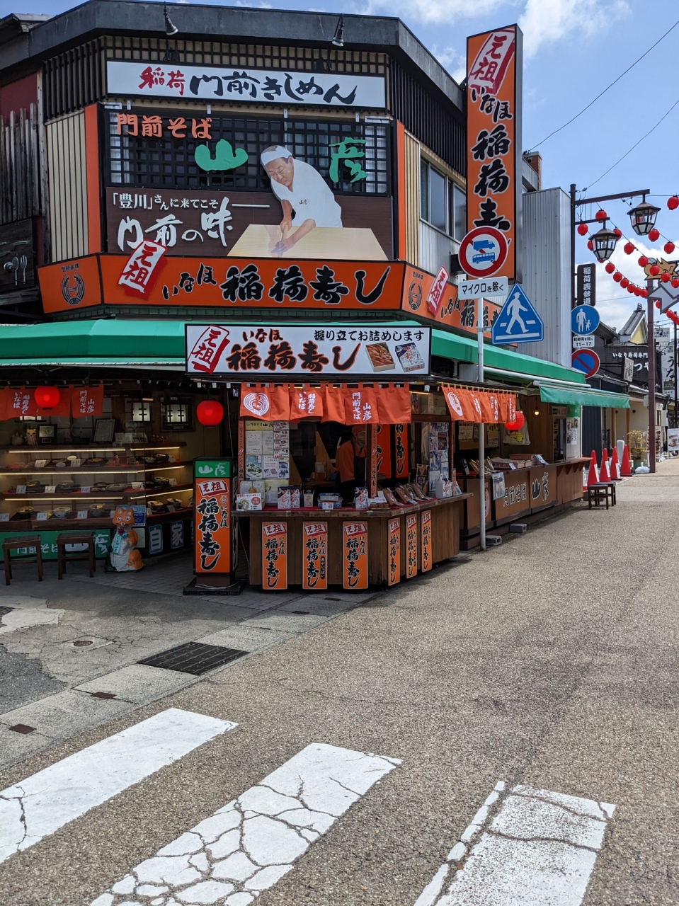 豊川稲荷の総門前にある100年以上の歴史を誇る老舗店です。名物「いなほ稲荷寿司」は、ひじき、人参、椎茸、クルミ、竹の子が入った五目稲荷寿司で、店内でも食べることができるようですが、おみやげにも最適なのでオススメです。