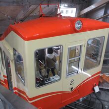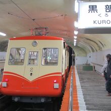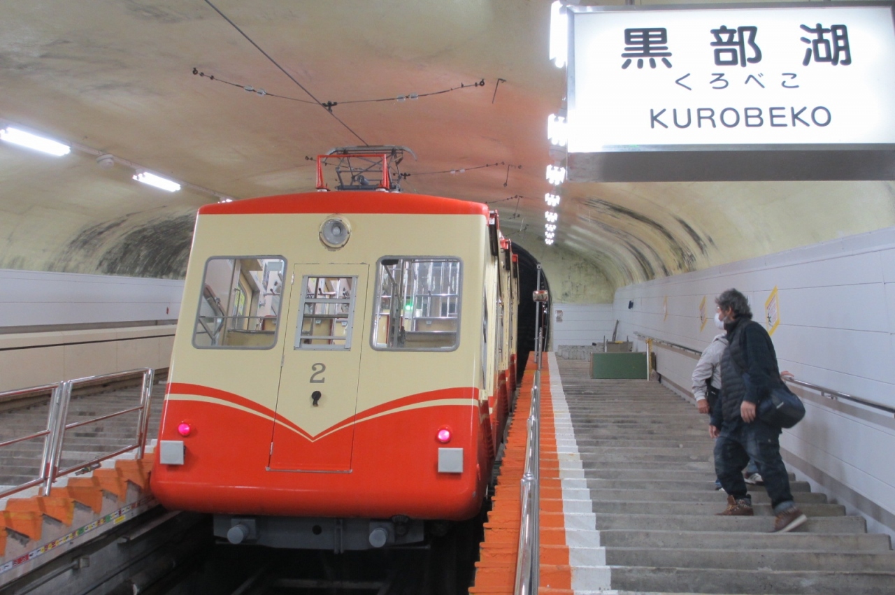 立山黒部アルペンルートのツアーで乗りました。黒部平駅から黒部湖駅までの高低差373m、長さ800mを5分で運行しています。最大傾斜30度です。トンネルの中を通るので急な傾斜を意識することなく乗車していました。暖色系の車両は暗いトンネル通行を明るい気分にさせてくれました。