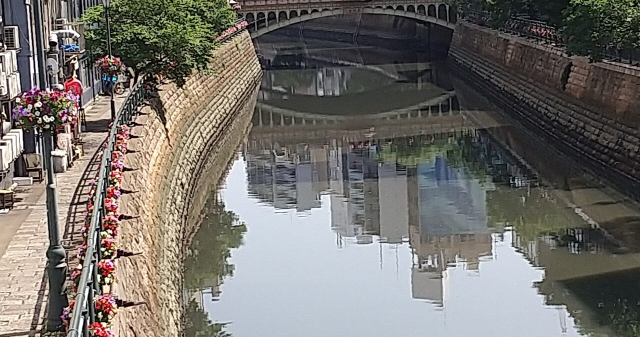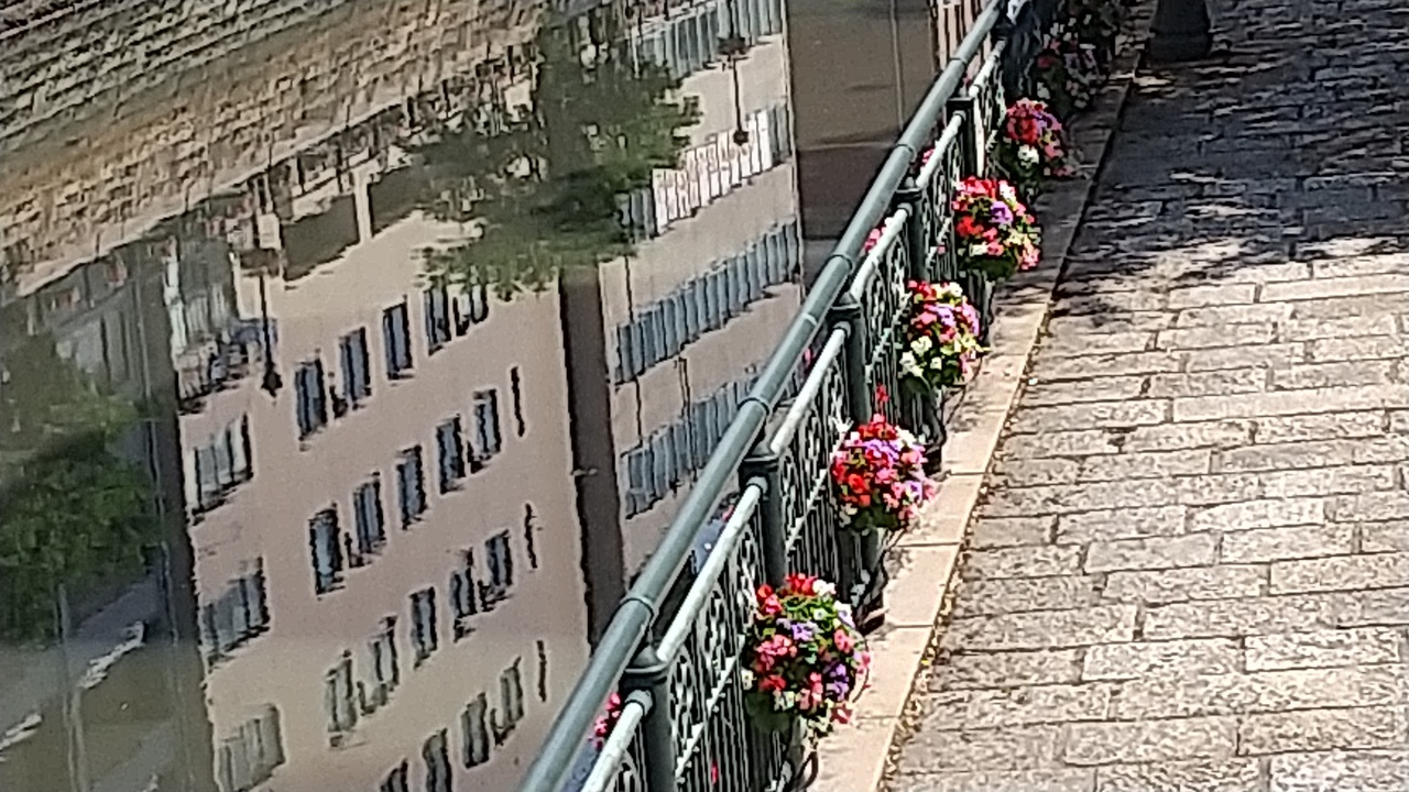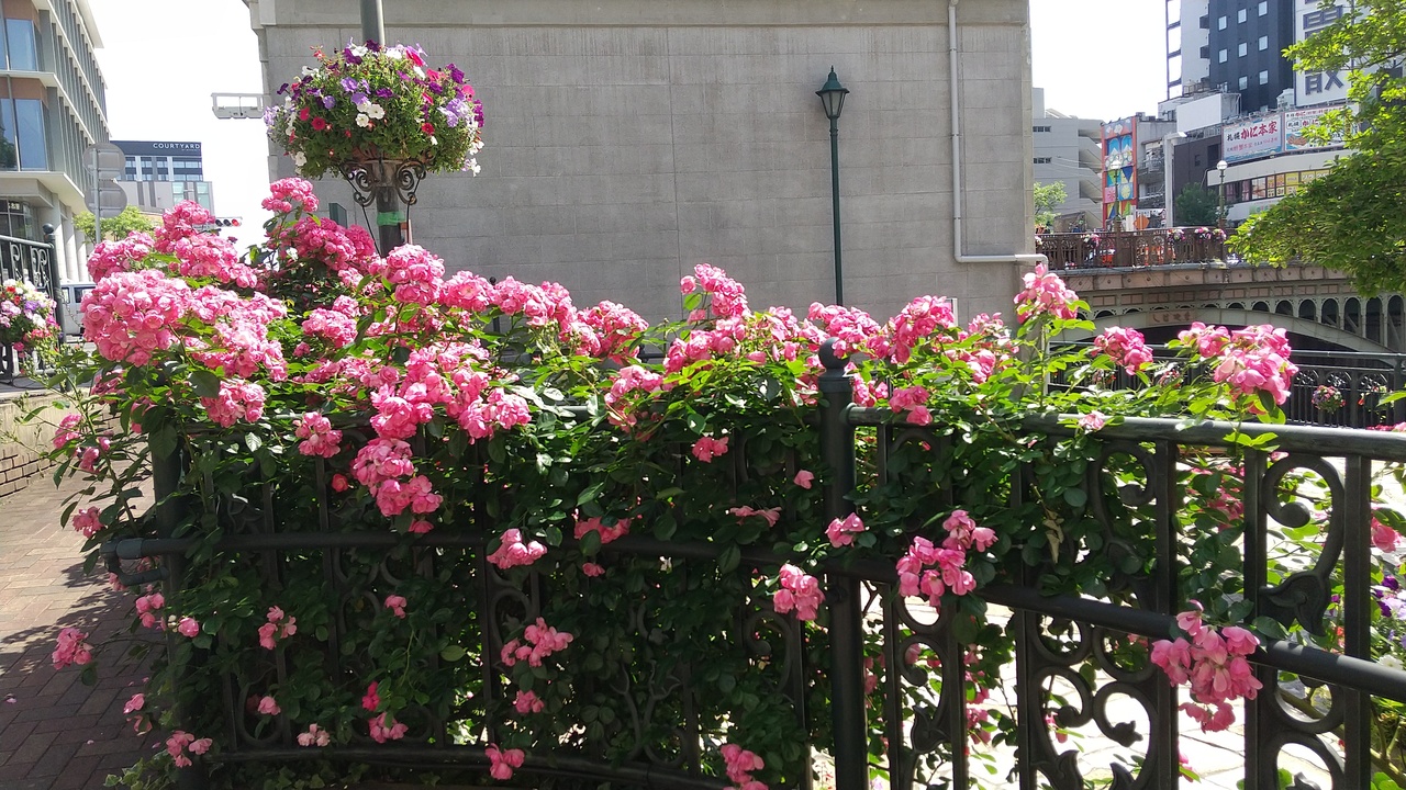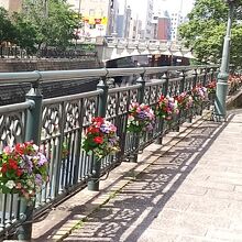 堀川に掛かる素敵な橋。堀川沿いの遊歩道に市民が寄せ植えしたハンギングバスケットが飾られ4月中旬から今年は5月21日まで約1ヶ月、川の両サイドに飾られ美しい風景です。