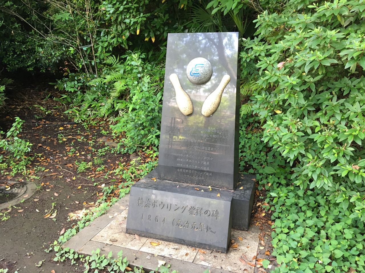 みなとみらい線の元町・中華街駅からフランス橋を渡って海の見える丘公園に入ってすぐの広場のような場所に「横浜ボウリング発祥の碑」と書かれた石碑を見つけました。ローズガーデンのバラを見に来ていたので、ボウリングのピンとボールがデザインされた石碑と海の見える丘公園がすぐには結び付きませんでした。