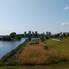 治水対策のためか敷地は広く、周囲に高い建物が無いため空が広く感じられた。開放感のある空間で、人の姿も多く見られ賑わいが感じられた。