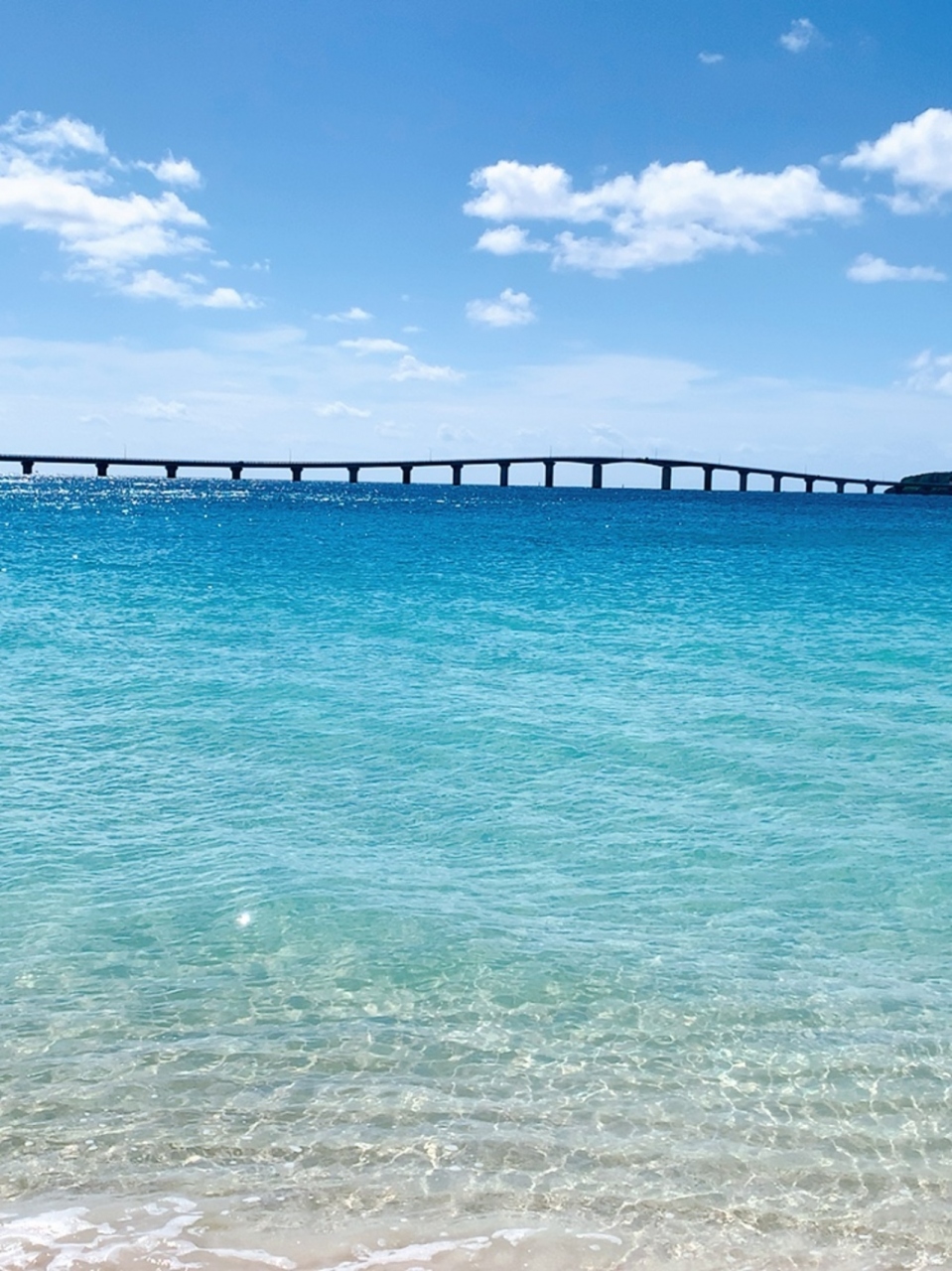 橋から見える海の景色も勿論素晴らしいのですが、来間島に渡ってから、竜宮城展望台に上ったところから見る来間大橋、宮古島側に戻ってきて、有名な与那覇前浜ビーチから遠くに眺める来間大橋もめっちゃキレイです。 お天気がよければ尚更! 何枚も写真撮っちゃいました。