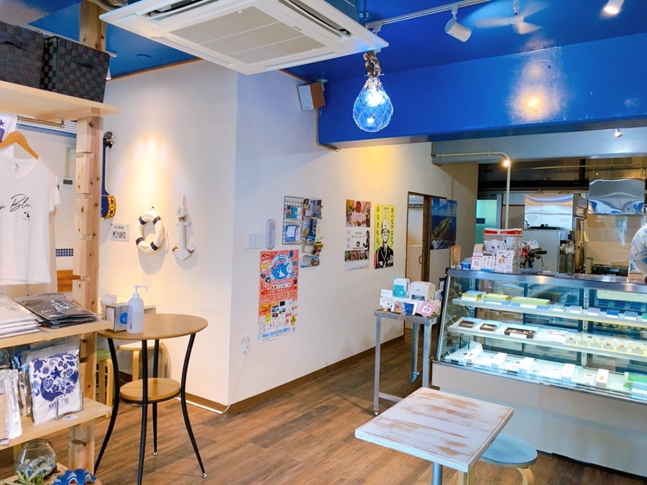 お店の外観、店内共に、白と青を基調としたデザインでとてもオシャレなカフェです。 入口には、オリジナル?と思われる宮古島まもる君もいました。 店内の、青く塗られた三線と、濃厚なトリプルカカオスムージーを一緒に写真撮り、良い思い出になりました。