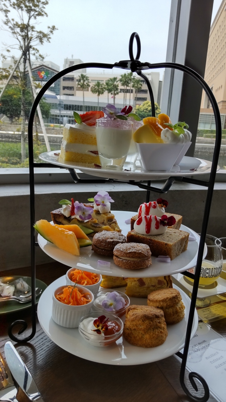 馬車道の駅近く、横浜コスモワールドの観覧車がよく見える、アパリホテル&リゾート内の、アフタヌーンティーに4種のビール飲み比べセットをいただきました。