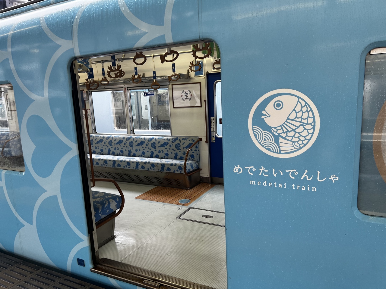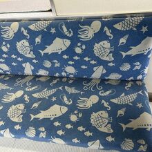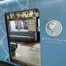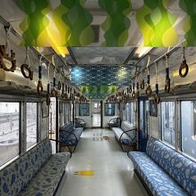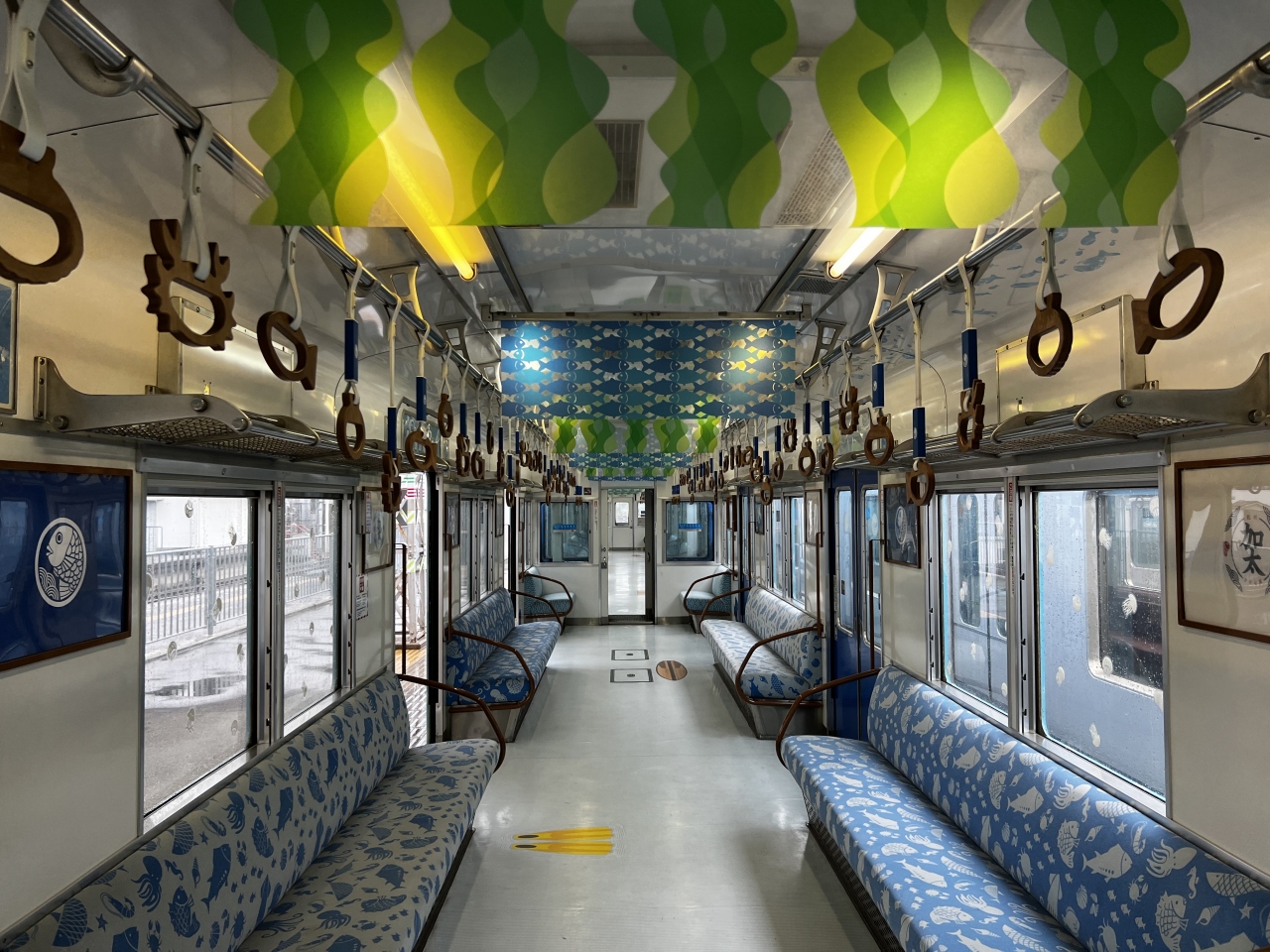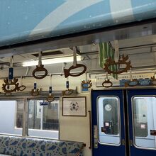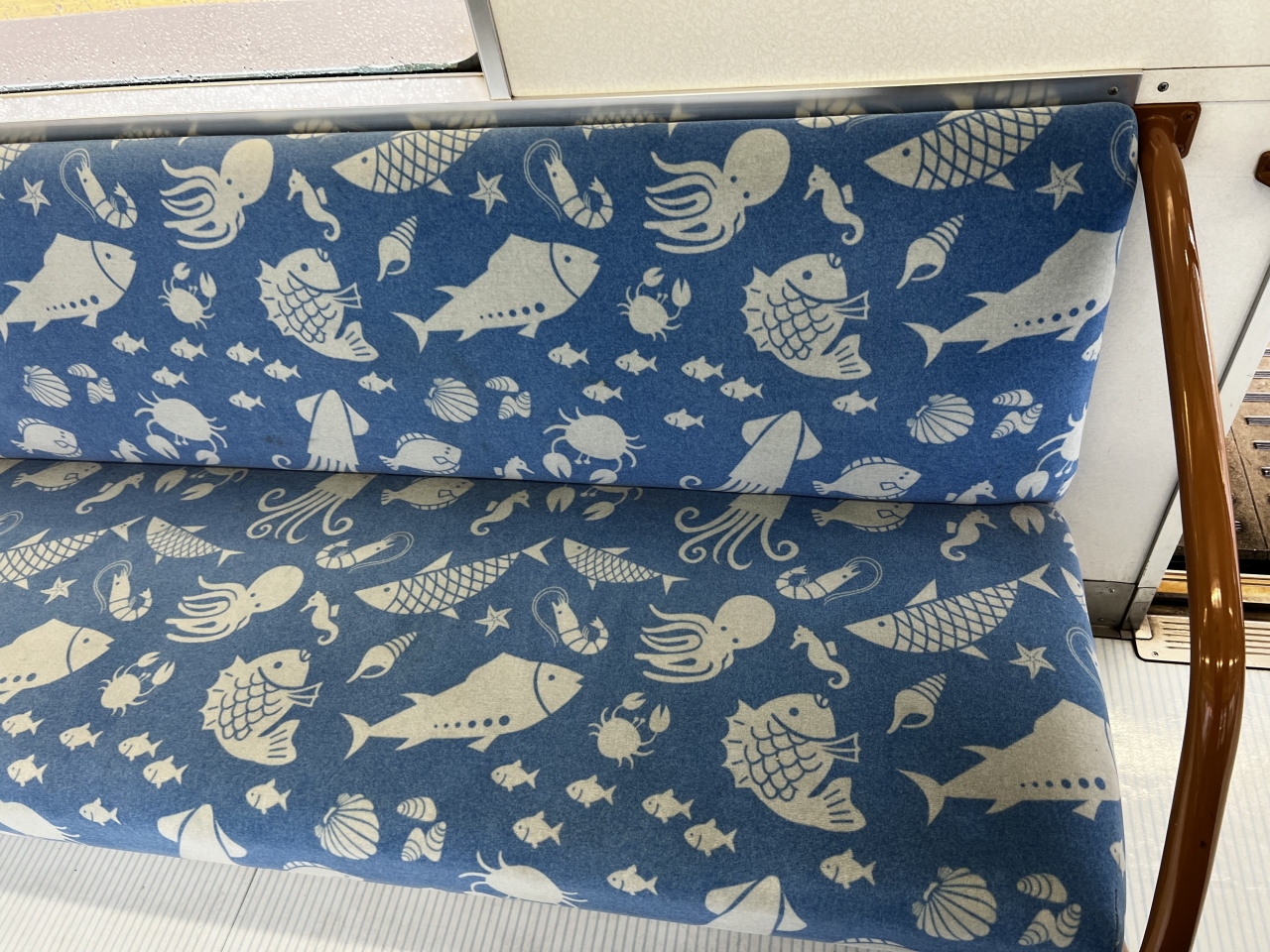 シートにおさかなの絵が書いてあったり、つり革が魚やカニの形になっている。