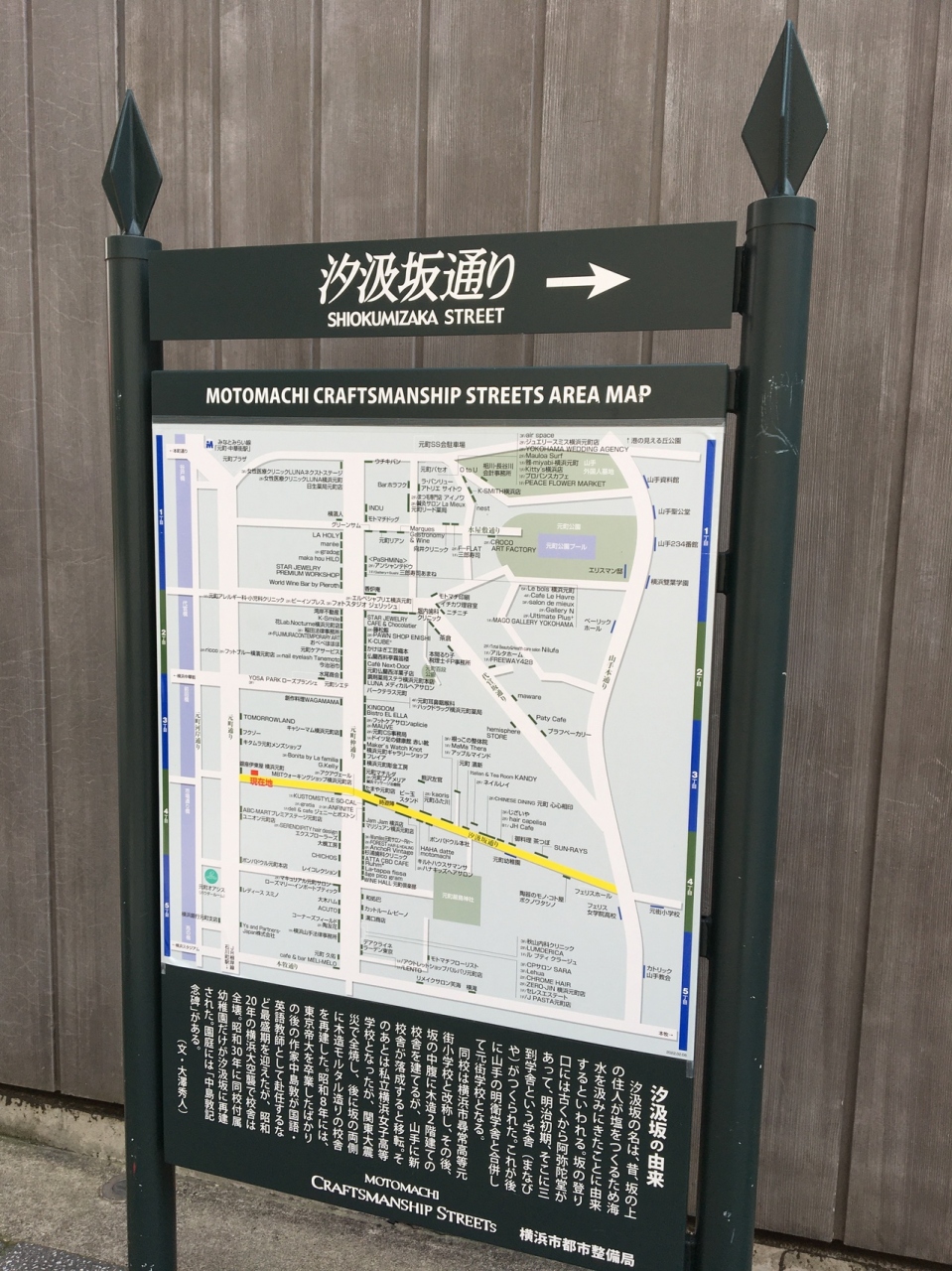 横浜の元町エリアからフェリス女子学院へ至る坂道です。坂道のふもとである元町エリアには、老舗パン屋さんのポンパドウル本店があります。横浜の山手エリアは汐汲坂を含めて多くの坂道があります。汐汲坂は、昔坂の上に住む住人が塩を作るために海水を汲みに来たことに由来するそうです。