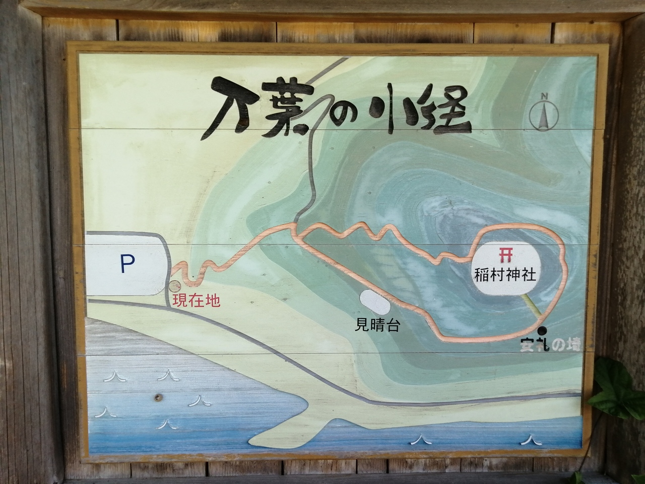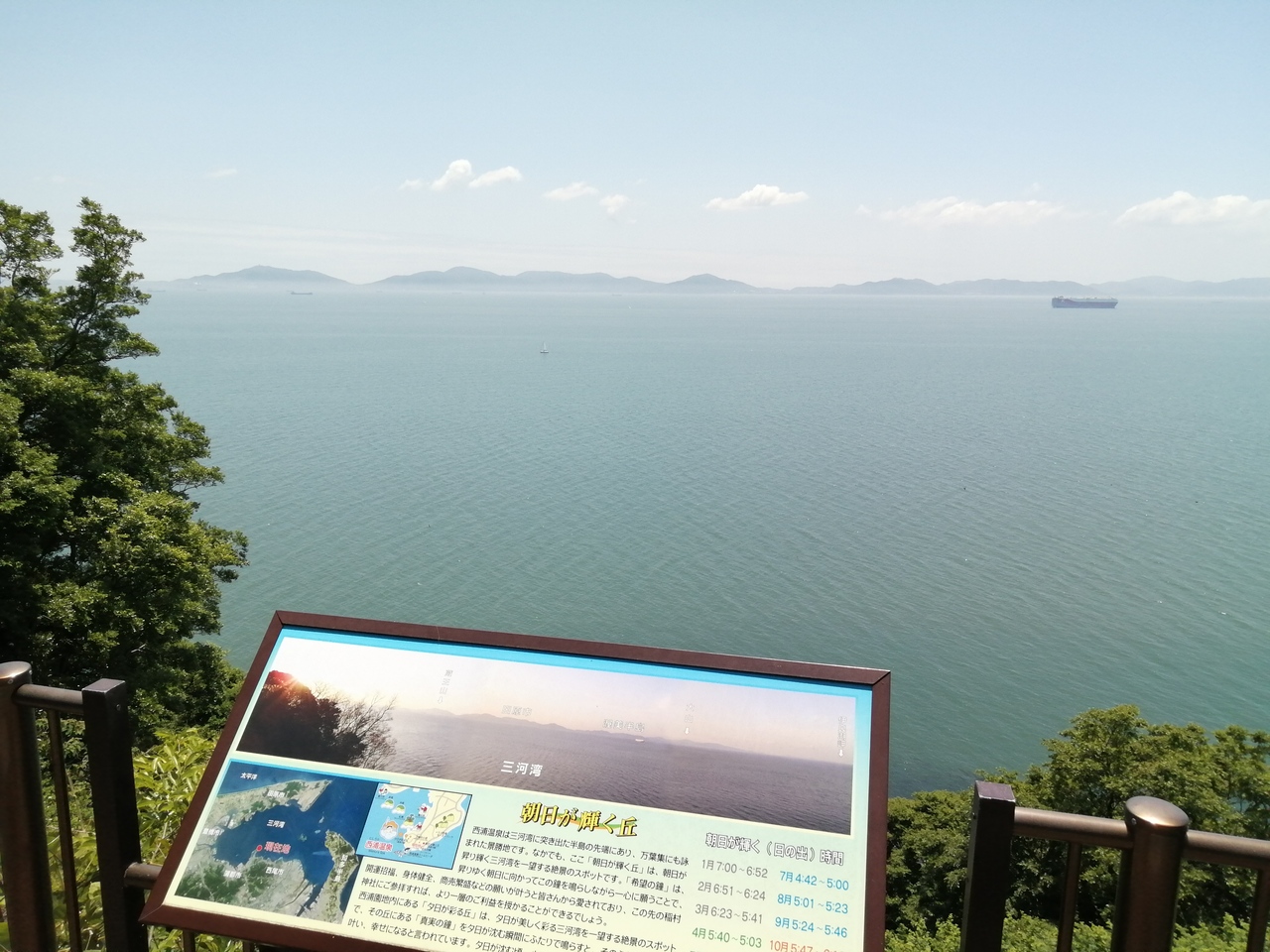 西浦温泉のパームビーチ背後にある小山の頂上にある神社です「万葉の小径」を使って登ることができます。所要7~8分とお手軽な登山ですが一気に登るので結構しんどいです。小さなお堂が1つありますが、人けがないので寂しいところです。参道にもなっている階段を下りれば「朝日が輝く丘」という三河湾が一望できる展望台があります。